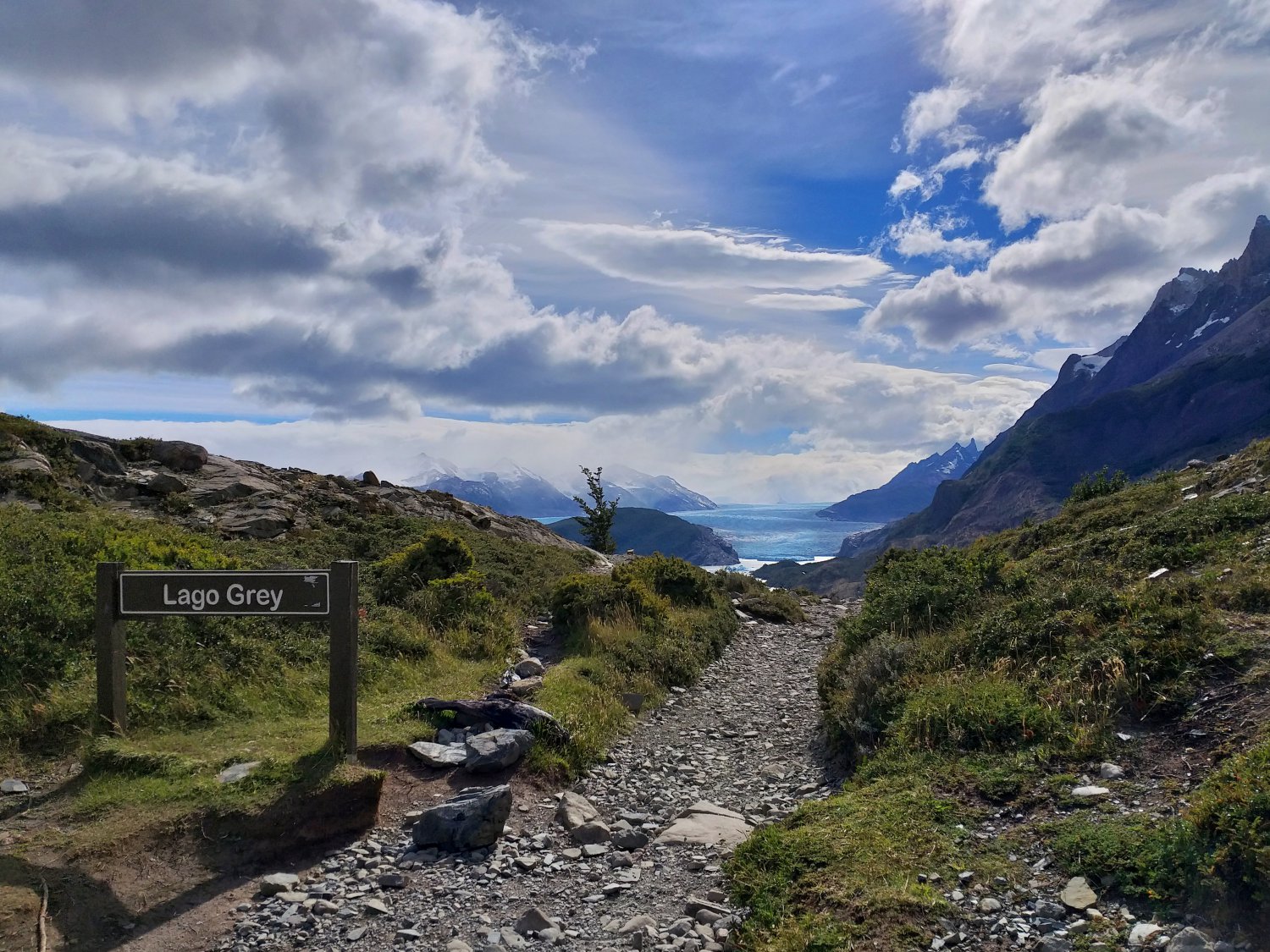 Após cerca de 1 hora caminhando chegamos na Laguna Los Patos. Tinha bastante vento nessa parte. E a partir daí começou a ficar interessante, porque a vista ficou bonita. Fomos margeando o Lago Grey, e depois de 1h30 chegamos no Mirador Lago Grey, de onde pudemos ver a geleira Grey pela primeira vez.