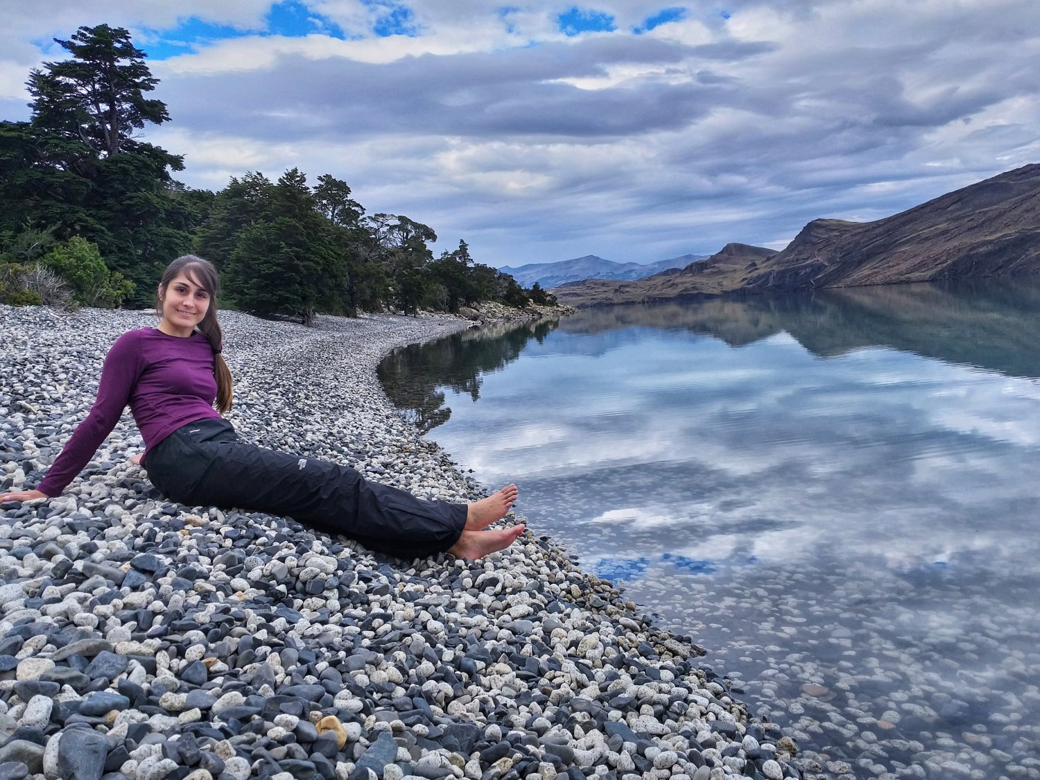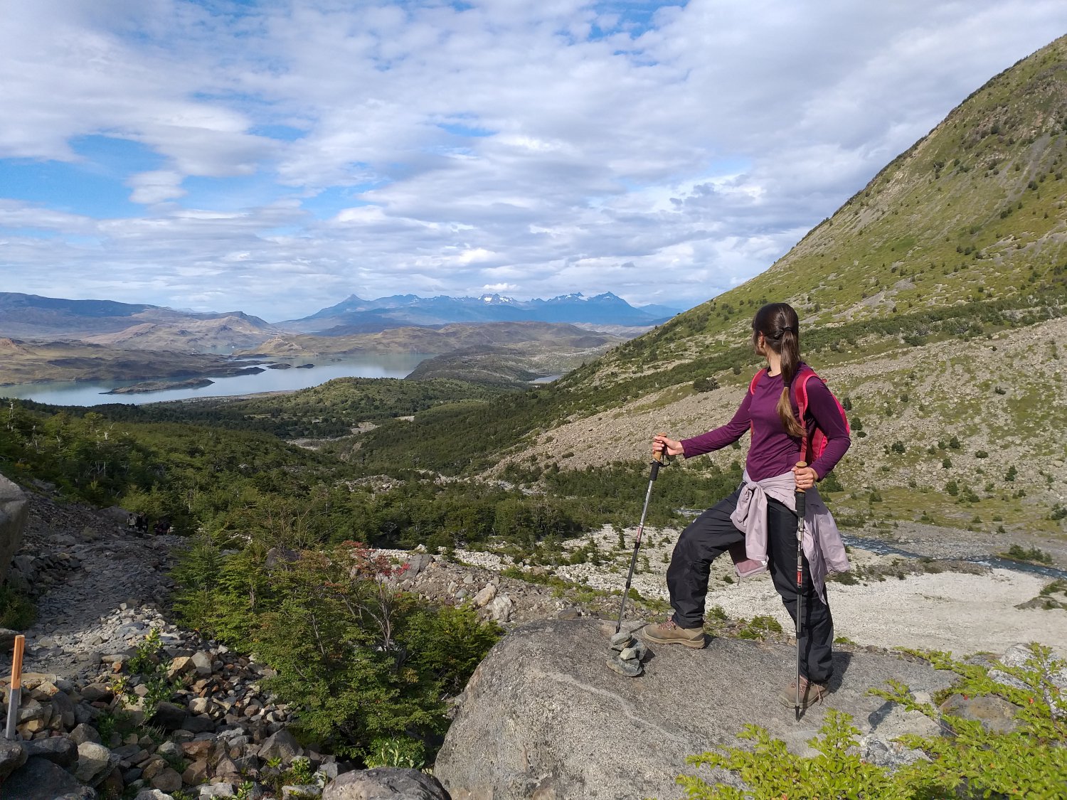 No próximo trajeto tínhamos uma linda vista do Lago Pehoé no nosso lado direito no início da trilha e depois avançamos sempre com a montanha Paine Grande e Los Cuernos à nossa frente. Essa vista das montanhas me deixou maravilhada. Passamos pelo Lago Skottsberg, pelo camping gratuito Italiano e chegamos enfim no camping Francês às 18h. Total: 21,6 km.