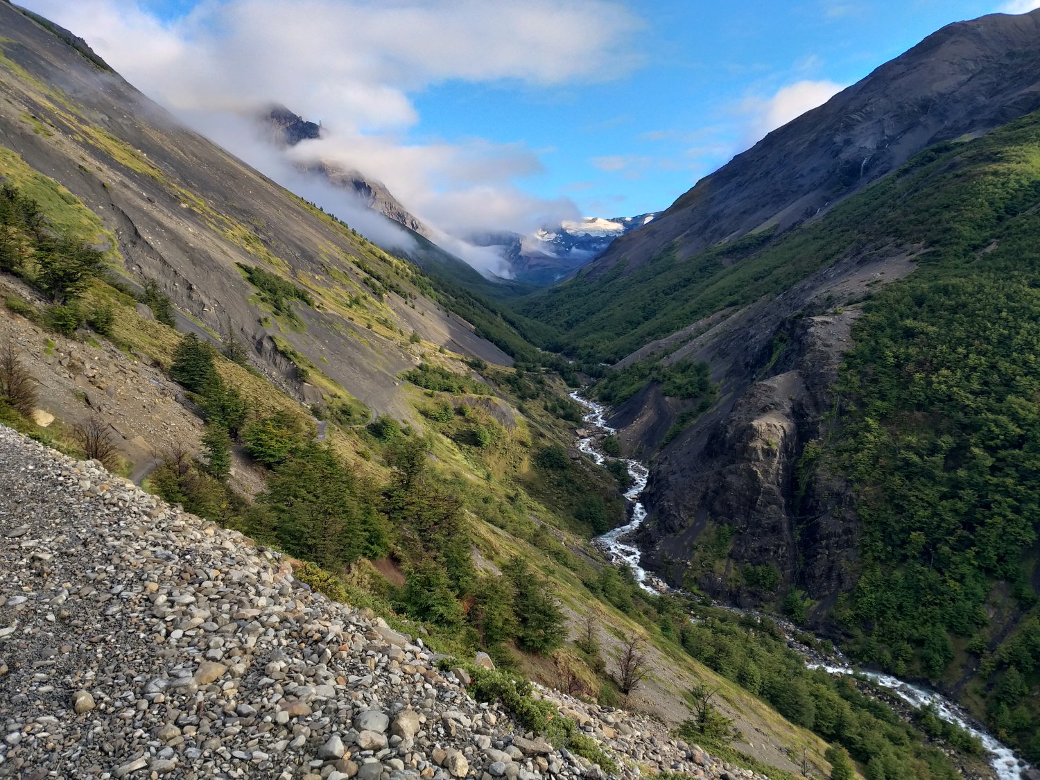 Um pouco antes do Chileno passamos pelo Vale Ascencio, onde a caminhada era ao lado do penhasco, onde lá embaixo corria o rio Ascencio. Que lugar incrível! Li muitos relatos de que nessa parte tem muito vento e as pessoas precisam andar agachadas, mas nesse dia não tinha nada de vento!