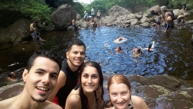 Também andamos por pedras e travessias no rio. Ao chegar no final da trilha, nos deparamos com uma piscina natural de água bem límpida. O dia estava calor e entramos na água, que estava bem gelada.