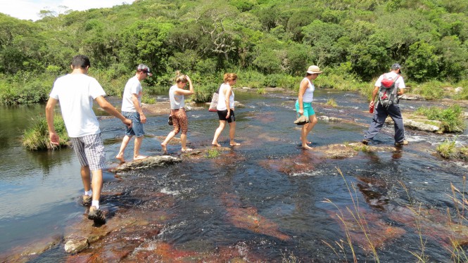 A caminhada inclui passar por riachos como esse, que em algum momento, despencam da borda do cânion.