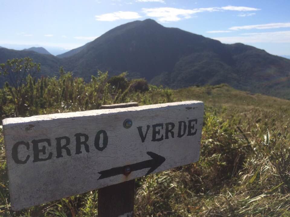 Depois de muita ralação, suor e pernada chegamos na bifurcação que levava ao Itapiroca ou ao cume do Cerro, que estava logo ali, quase palpável com as mãos, um pessoal que estava descendo perguntou o caminho pro Itapiroca e eu indiquei (foram as primeiras pessoas que encontramos naquele dia, e eram do nosso grupo, mas não sabíamos ainda), agora era nossa hora de subir, mocamos as mochilas ali no mato mesmo e partimos, em menos de 10min nós três fincamos o pé no cume do Cerro Verde (1660m), eram 14h15, foram mais ou menos 3h30 de trilha até ali, não foi mal. O vento estava fortíssimo no cume, dizem que chegaria naquele dia a 60,70km/h, assim que coloquei o boné na cabeça o vento arrancou pro infinito, até pra segurar o cel pra tirar fotos estava arriscado, subi na pedra do cume, assinei mais um livro e bati rápidas fotos, mal deu pra aproveitar, o lugar é lindo e tu fica de frente pro Ciririca e paredões de pedra imensos, além da bela vista da baía de paranaguá, em dias bem limpos se vê a Ilha do Mel, mas logo demos meia volta e analisando o cume vimos que 4,5 barracas ali já lotam o espaço. Rapidinho voltamos e pegamos as cargueiras, o vento soprava forte e o caminho a seguir era descer, eu já estava com um pouco de pressa, era pouco antes das 15h, mas pelo nosso ritmo sabia que iríamos pegar um trecho de trilha no escuro.