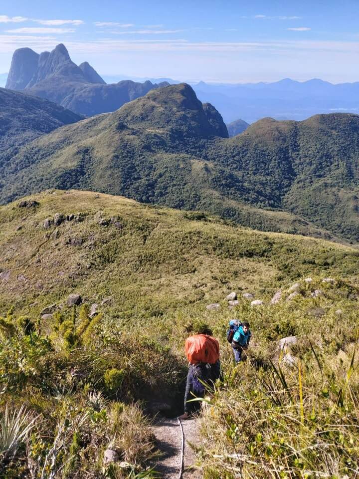 Fui indo bem de boa na rabeira do grupo, não queria imprimir meu ritmo, vez ou outra me pediam pra ir adelante, mas eu negava, queria ir curtindo o visual somente, e era dos mais lindos, aquele fim de tarde com o sol emoldurando a paisagem era algo divino, achamos até a ‘Pedra do Sapo, da Andorinha, ou algum nome que o valha’, e descendo a crista de pedras o pessoal deu uma enroscadinha, mas coisa normal, porque tinha que desescalar alguns trechos e quem tem perna pequena sofre mais, passados todos os momentos de dúvidas, superação e tomadas rápidas de decisão, veio a magnífica sensação de dever cumprido. Chegamos no A2 por volta de 18h, nos despedimos até o dia seguinte onde eu os encontraria na fazenda, desejei uma ótima decida, que fossem com Deus e com as lanternas ligadas, teriam que descer na raça, mais uma provação fudida pra aquele grupo que talvez fosse considerado o ‘mais fraco’, porém estavam longe disso, andaram quase que ininterruptamente por 17 horas, desde quando saímos do Itapiroca 10h da manhã, até as 3h da madrugada do dia seguinte, que foi quando elas chegaram na fazenda pico paraná, fazendo toda a trilha de volta de noite e debaixo de neblina, indo bem devagarzinho e ajudando um ao outro, chegaram às 22h no ponto que mocaram as cargueiras, e de lá até a fazenda foram mais cinco horas, chegando às 3h da manhã pra finalizar a travessia com sucesso, outros podem ter feito mais cumes, com menos cansaço e em menor tempo, mas encarar o que elas encararam na volta, acho que foi o maior feito da travessia, então todo meu respeito e admiração a essa nossa equipe, Tamires, ilda e Tales.