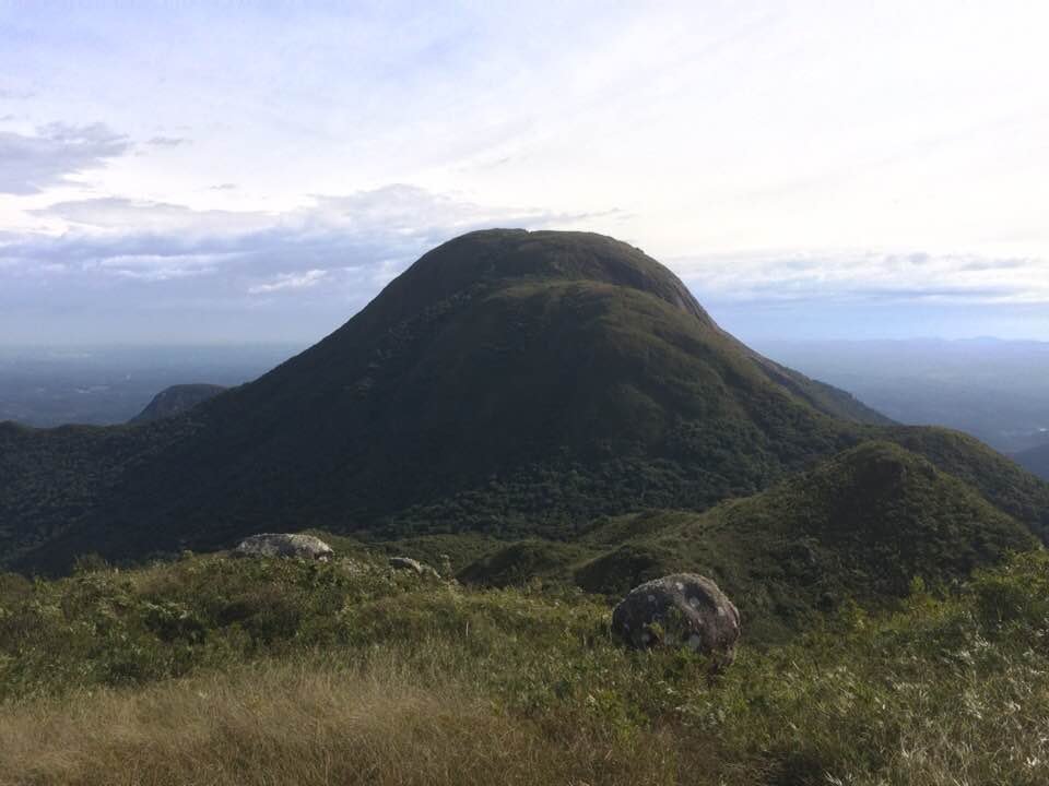 O dia estava lindo e o céu azul, o clima bem agradável, e como eu ia naquele sistema de anda e para eu acabava ficando bem descansado enquanto elas penavam um pouquinho mais, só que eu fazia umas paradas estratégicas onde tinha um fiapo de sombra para elas descansarem também, afinal são filhas de Deus, e como nada é pra sempre, ao cabo de 6h46 de trilha, chegamos ao Camapuã (1706m), nosso 1°cume! Já tinha uma galera curtindo o cume, assim que cheguei já me joguei em umas pedras a mó de descansar um cadinho e esperar as meninas que vinham logo na rabeira, imaginei que chegar ao cume as animaria, a ilda ficou animada sim, a a tamires ficou mais contida, mas curtiu também com certeza, eu e a ilda tiramos algumas fotos, fomos assinar o livro de cume, e ali é o primeiro lugar que dá pra por as vistas no Pico Paraná (PP), uma montanha que a ilda nunca tinha posto os olhos e viu pela primeira vez. Ficamos pouco tempo lá e já fui acelerando o passo pro Tucum, já que o plano ainda era acampar no Cerro Verde, que fica após o tucum, e nos adiantaria a caminhada pro segundo dia de travessia.