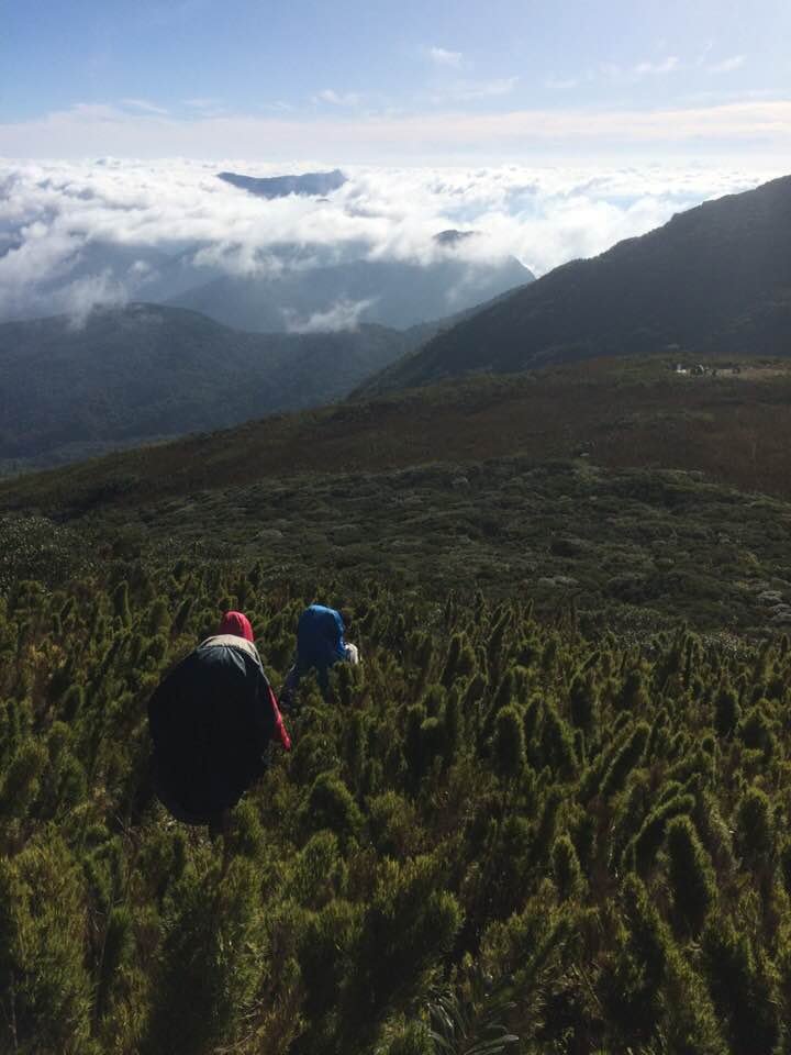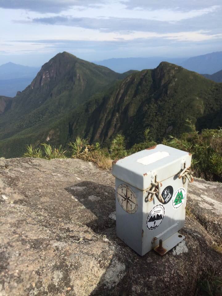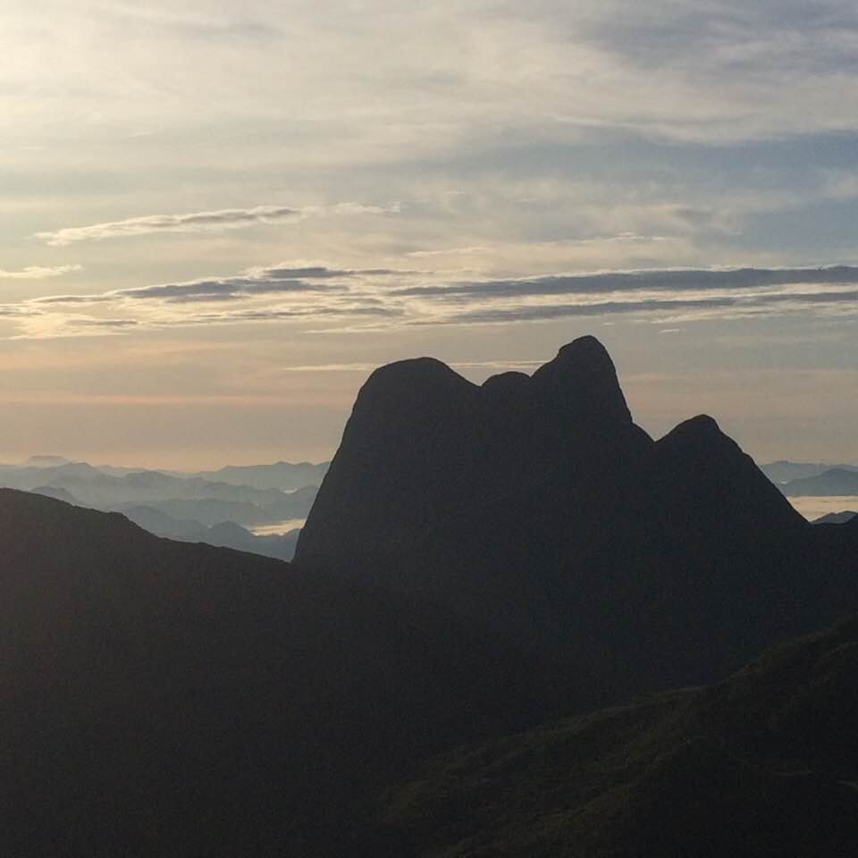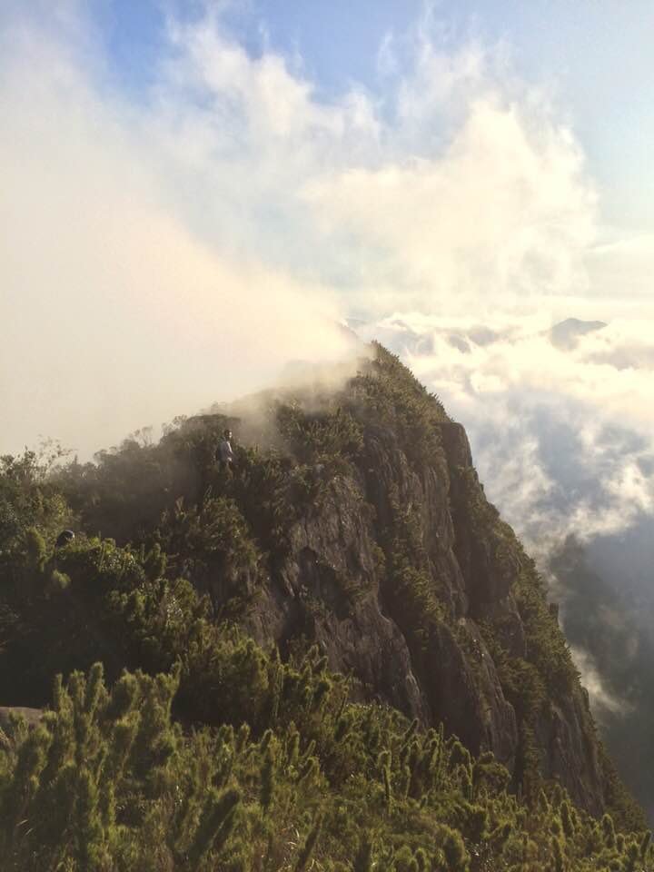 6h comecei os trabalhos, acordei já sem sono e descansado, fui dar uma voltinha no cume, tirar umas fotos e ver o nascer do sol, que saia por detrás do Ferraria que eu via ao longe, sentei numa pedra de frente para o PP e a sequência montanhosa que o rodeia, ouvindo músicas, pensando em tudo enquanto mirava um tapete de nuvens a perder de vista por todos os lados cobrindo desde o porto de Paranaguá até montanhas e picos que mal sei os nomes, buscar inspiração e forças olhando pra essa dádiva não é difícil. Voltando à barraca passei pelos nossos vizinhos, que eram pai e filho, montanhistas ali do paraná mesmo, até por isso já tinham pisado em boa parte dos picos da serra, conversamos um cadinho e eles me deram boas dicas e noções de tempo e distância pra conseguir chegar ainda hj até o Itapiroca, com essas info no bolso voltei pro acampamento e as meninas ainda estavam acordando, fui tirar algumas fotos e a ilda veio depois para assinarmos o livro de cume e registrar o momento. Depois de todos prontos partimos, um pouco tarde, 10h08, mas o que poderia ser um erro acabou sendo a peça chave pro dia terminar do melhor jeito, chegaremos lá…