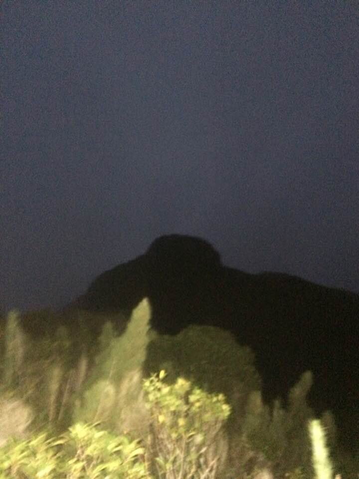 Depois desse penoso trecho e cada vez mais perto, já dentro da mata alcançamos a parte da trilha em que se passa por grandes pedras, é um trecho em que se tem que usar bastante as mãos para se apoiar e ganhar impulso sob elas, basicamente escalaminhar, aí já íamos todos os três juntos, e com lanternas ligadas, nesses momentos é melhor ir todo mundo junto, caso alguém precise de luz ou algum auxílio. Nas partes com rochas que precisavam ser escalaminhadas as meninas tiveram dificuldade, mas passaram, e com as cargueiras nas costas, a ilda mesmo não gostava muito que a ajudasse, e eu respeitava; (no dia anterior uma guria disse assim a quem ia ajudá-la, ‘’não me ajuda não, senão parece que eu não consigo’’, muitos devem pensar dessa forma); nesse momento estávamos em um mundo á parte, em transe, com o único objetivo de ir rasgando aquela trilha até chegar ao topo, chuva caindo, e a gente com o coração na ponta da chuteira, esses trechos pra mim ficaram marcados, me sentia muito bem, a trilha tava tão boa que dava até dó de terminar. Nisso já eram quase 19h quando chegamos numa parte já no alto em que se entra e sai da trilha passando por cima de grandes pedras, e não dava pra ver quase nada sem a lanterna ligada, nuvens de chuva passavam sob nossas cabeças, as luzes das cidades ao fundo se destacavam, e vivenciar aquilo tudo foi um grande privilégio, embora eu também pensasse ‘o que eu to fazendo aqui em cima com esse tempo’, enquanto a trilha nos fazia subir e descer do lugar que até pensamos ser o cume, embora sem ctz, numa dessas voltas pra dentro da trilha avistei lanternas acesas, já me animei pq naquela situação encontra alguém poderia ser um bom negócio, chegando mais perto vimos que era o casal e o tales, galera que tínhamos encontrado no ponto d’água, eles tinham chegado a pouco, com a chuva que estava caindo eles acabaram desistindo de ficar no cume, montaram acampamento ali mesmo numa pequena baixada entre as árvores, num ponto estratégico da trilha, as meninas rapidamente se arrumaram com ele pra ficar na barraca mansão (uma ntk de 5 ou 6 lugares), e eu na dança das cadeiras quase rodei pq o pessoal já tinha pego os lugares mais planos, e procurando não achei nada minimamente plano, montei a barraca numa saída lateral da trilha, uma inclinação de uns 20 graus, era o melhor pra hoje. Terminamos nosso segundo dia de trilha com mais de 9h de caminhada, a exemplo do dia anterior onde andamos por quase 10 horas.