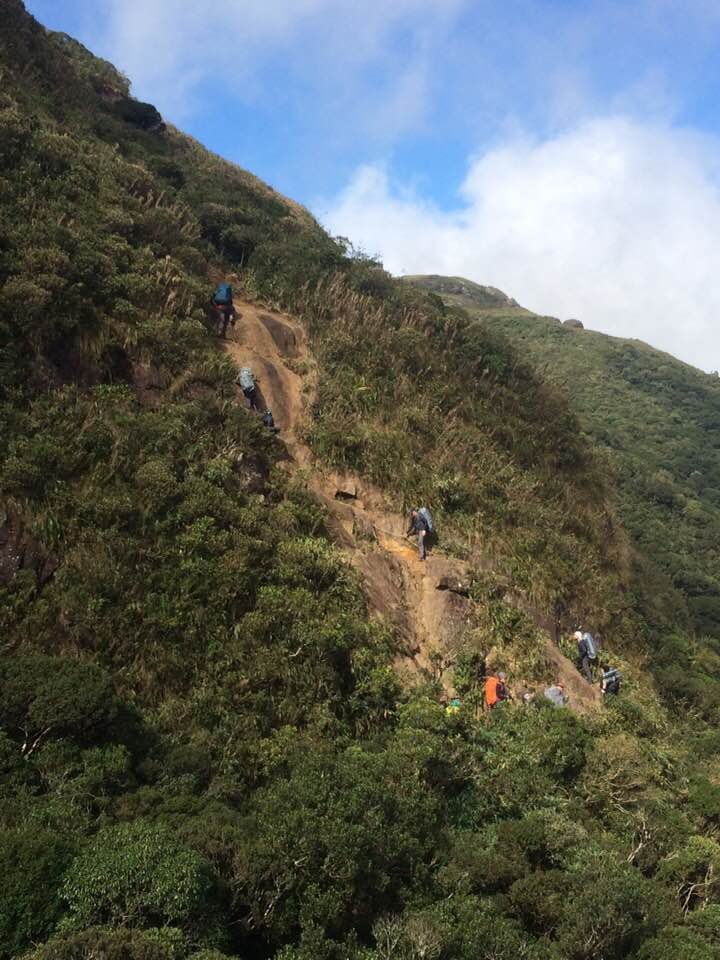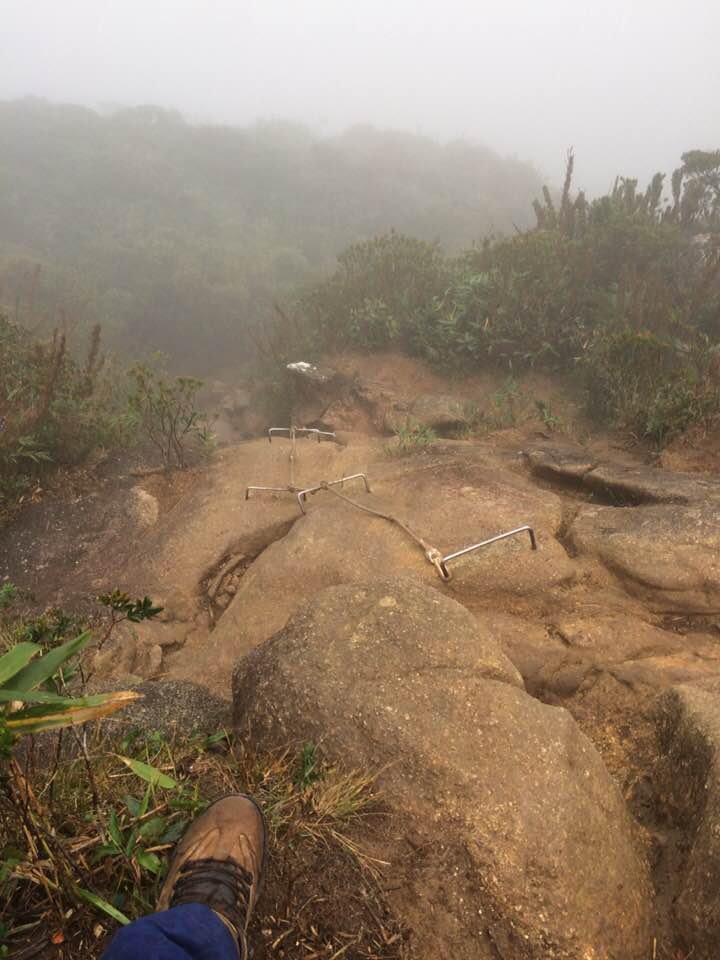 Quando cheguei na base da maior via ferrata da trilha do PP, havia um congestionamento e dos grandes, o jeito era esperar né, o grupo era de umas 20 pessoas, com ‘guia’ e tudo, embora os ‘guias’ não estivessem dando o suporte necessário. As ferratas ali são auxiliadas por cordas, o que facilita muito, o paredão deve ter por volta de uns 25m, sei lá um chute, porém pelo que percebi muito do pessoal ali era inexperiente e alguns carregando cargueira pela 1°vez, em sua maioria meninas, resumindo só pra começar a subir esperei 20min, e nesse trecho tem um pouco de escalaminhada também, então tu vai subindo pela rocha, sempre auxiliado pelos grampos e pedaços de corda, com bastante atenção e calma, mas tem muita gente que tem medo de altura ou simplesmente trava, e isso que lasca tudo, então a galera me deixou passar na frente e subir logo, e claro que eu fui, a ideia era justamente aquela, passar por aquele grupo e chegar no A2 primeiro pra montar acampamento. Se aquele era o trecho mais difícil da trilha, pra mim foi fácil, passei muito bem pelas ferratas e continuei tocando pra cima, ao escalar esses grampos uma dica básica de segurança é sempre ter três membros seus apoiados antes de colocar a mão pra alcançar o próximo, como já vínhamos desde quinta subindo, descendo, passando por cordas, correntes, uma ou ou outra ferrata, o couro já tava calejado. Depois da ferrata vem um trecho de subidão constante com trilha aberta entre pedras, e ali eu acelerei pra valer pra criar uma distância do pessoal que vinha atrás, mas nessa hora o corpo sentiu o esforço, como tinha comido quase nada o dia todo, a bateria foi falhando, parei numa pedra com a sombra das árvores, sentei, tomei uma caixinha de água de coco, mastiguei um pouco de amendoim e banana passa (que era só o que eu tinha), e fiquei respirando e respirando, mas não fiquei muito tempo ali não, quando senti que a energia estava voltando, levantei e segui, o sangue ainda estava quente, era bom não esfriar, essa foi a parte de toda a travessia que eu mais senti, por estar fazendo um esforço brutal a várias horas e por alguns dias já, e ter comido pouco no dia, com calma consegui reverter a situação e voltar bem na trilha.