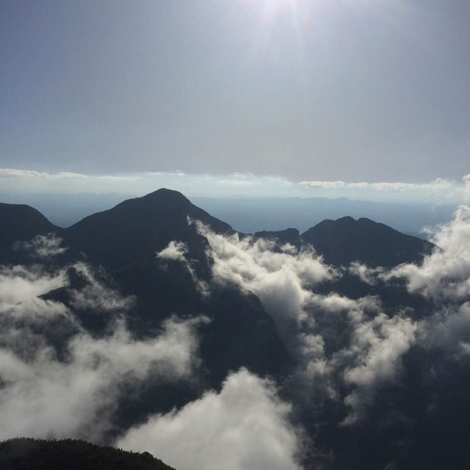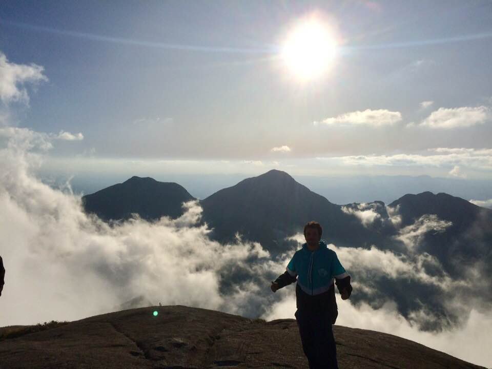 Lá sentei e fiquei apreciando aquela paisagem única, pra mim a mais bonita hasta hoy, de frente para o União e o Ibitirati, que fazem parte do conjunto PP, à esquerda o Caratuva, Taipabuçu e Ferraria, o sol estava bem alto e escurecia os picos, causando aquele misto de coloração de azuis claro, escuro, e branco, as nuvens bailavam ao redor dos cumes e faziam um imenso colchão por trás deles, enquanto isso a galera que estava no cume ia ouvindo um som, se divertindo e dando risadas, o clima estava ótimo, o momento era único!. Uns 20min depois chegou a minha turma, Tamires, Ilda e Tales, demoraram mas chegaram, foram casca grossa, apesar de alguns empecilhos chegaram todos inteiros, tínhamos cumprido nossa missão como grupo, fechando a travessia e a conquista de cumes com o Pico Paraná, nosso 5°cume, foi um momento muito legal pra nós estarmos todos juntos, reunidos num lugar que víamos desde quinta-feira; se bem que quando elas chegaram o tempo fechou, fechou de nuvens e não dava pra ver quase nada, pessoal ficou meio decepcionado, mas eu insisti pra ir esperando um pouco e no finalzinho antes de ir embora a janela abriu e deu pra eles ficarem boquiabertos e tirarem fotos, fotos raras, porque juntos mal tiramos fotos. Eu ia até ficar um pouco mais, estava na dúvida se ficava ou não pra ver o pôr do sol, mas o tempo foi fechando de novo e achei melhor descer com eles por volta das 16h30, sempre é difícil ir embora desses lugares, mas tenho certeza que vou voltar, porém descer com eles foi bom pois seria nosso último trecho de caminhada juntos, iria até o A2 com eles, e de lá eles teriam a descida toda só pra eles.
