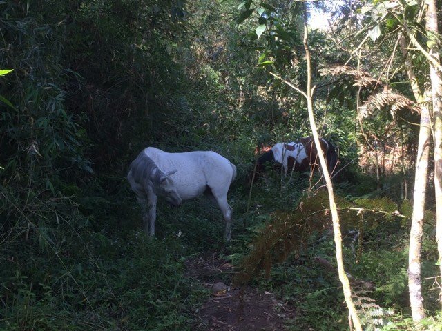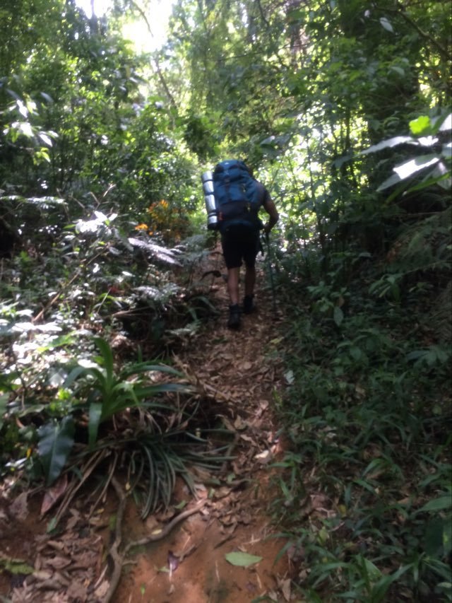 A trilha do jorge é uma trilha larga e bem intuitiva, coberta por exuberante mata atlântica, logo no início ao fundo se ouve o barulho de água corrente, lembrando que próxima a sua entrada tem a Cachoeira Toca do Lobo, que dá pra chegar por rápida trilha, no início ainda passando por degraus de pedra, encontramos dois ‘guias voluntários’ que nos advertiram para não acampar no pico, existem placas dizendo o mesmo, mas tendo em vista que é um lugar bem visitado, inclusive por gente local, porque ao invés de proibir, não conscientizar as pessoas? Porque dá mais trabalho! Porém é um trabalho que tem raízes duradouras. Após isso seguimos na nossa caminhada, subindo, subindo e subindo, essa trilha é muito agradável, sempre coberta do sol, embora a umidade se faça sempre presente, e o suor escorra farto, tem alguns pontos d’água então se hidrate bem pra manter o corpo forte e a mente atenta, pq é sempre subida e às vezes o chão pode estar escorregadio, pular sob troncos e encarar buracos traiçoeiros requer atenção. Nesse embalo fomos ganhando altitude e parando eventualmente pra descansar e beber água, até que já bem lá em cima, ouvimos barulhos no mato e nem imaginávamos que eram cavalos selvagens pastando bem no meio da trilha, lógico que isso nos fez parar, eram cerca de 6 ou 7 cavalinhos, e surpresos assim como nós, ficaram parados esperando a gente, tentamos espantá-los, mas não saíram, o jeito foi passar pelo cantinho mesmo e torcer pra nenhum dar um coice kkk. À essa altura o bosque dos duendes já estava perto e passando pela sua entrada, a crista da serra está logo à frente, uma última subida para testar o fôlego do trilheiro, além de uma bifurcação que se toma à esquerda, já na crista da serra, (indo pra direita, irá sentido Monte verde), caminhamos entre alguns pinheirais e araucárias e logo chegamos ao alto dos 1950m do Pico da Onça, onde os jardins suspensos do amplo gramado nos aguardavam para montar a barraca, o relógio marcava 16h12, como o tempo estava bem aberto e bonito íamos ter ao menos mais uma hora e meia de sol, tínhamos concluído a subida em 2h54, acumulando cinco horas desde a cidade.