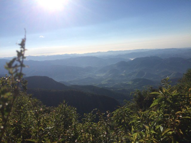 São Francisco Xavier, um cadinho maior que Monteiro, arrisco a dizer que vem espichando de tamanho por conta do ecoturismo da região, são muitas pousadas e estando lá percebo que muitos paulistas endinheirados estão comprando casas lá e elevando o custo de vida e estadia do lugar, acabando com a alegria dos mochileiros né, mas a cidade é uma graça, rodeada de morros e montanhas e com a tradicional pracinha com igreja e coreto, sendo um local tranquilo e sossegado para se passar alguns dias. Chegamos lá bajo fuerte sol, já fomos à padaria comer alguma coisa antes de subir. Padaria Vale Verde, muito boa em frente a praça, destaque pro biscoitão de queijo super barato e que vale quase que por um almoço, após rápido desjejum fomos já em direção a estrada dos Ferreira, estrada essa que é passagem obrigatória pro Pico da Onça, subimos a pé lógico e tudo ia bem até que por vacilo meu entramos num caminho à direita que foi parar na casinha de um caboclo nativo do lugar, fui conversar com ele e nos recomendou tomar cuidado com os javalis e onças lá em cima…Todo cuidado é pouco! Retornando à estrada certa, ela começou a ziguezaguear morro acima e nós a derreter de calor, paramos algumas vezes pra recuperar o fôlego e eu pra me aliviar da alça da mochila que estava rasgando o ombro por estar quase estourada, andar em estrada de chão debaixo de sol forte e carregando ainda todo o peso da viagem é uma prova de fogo que vai dizer se tu gosta mesmo daquilo ou se vai vender todos os equipamentos quando voltar pra casa kkk, foram 2h pra percorrer esses 5km até a fazenda Monte verde, que meio que marca o início da trilha, porque é o último local onde dá pra subir de carro, chegamos esbaforidos lá e deitamos num gramado rente a um banco de madeira pra beber bastante água e beliscar alguma coisinha, já pensando em diminuir o peso da mochila heheh, às 14h levantamos e colocamos nas costas as mochilas que mais pareciam armaduras, com previsão de mais duas ou três horas de caminhada fomos fazer o que tinha nos levado até ali.