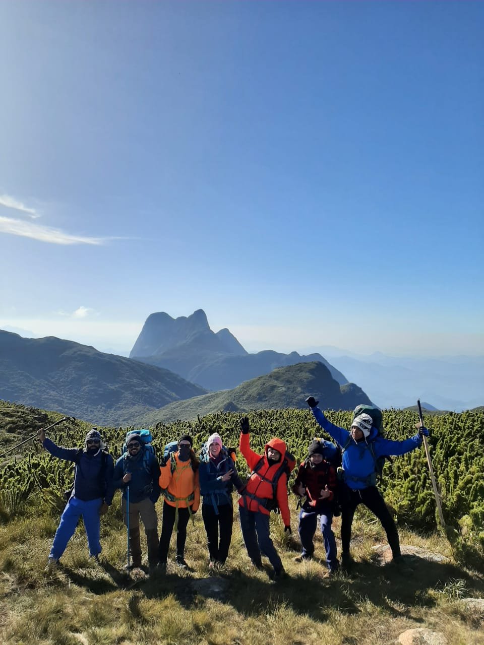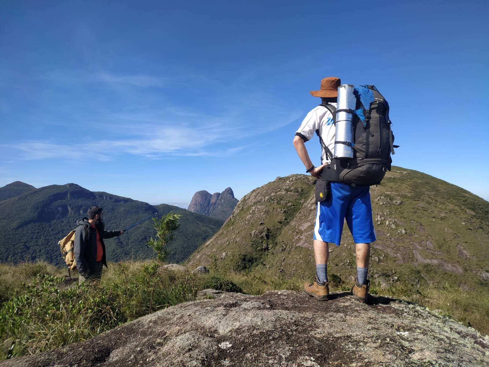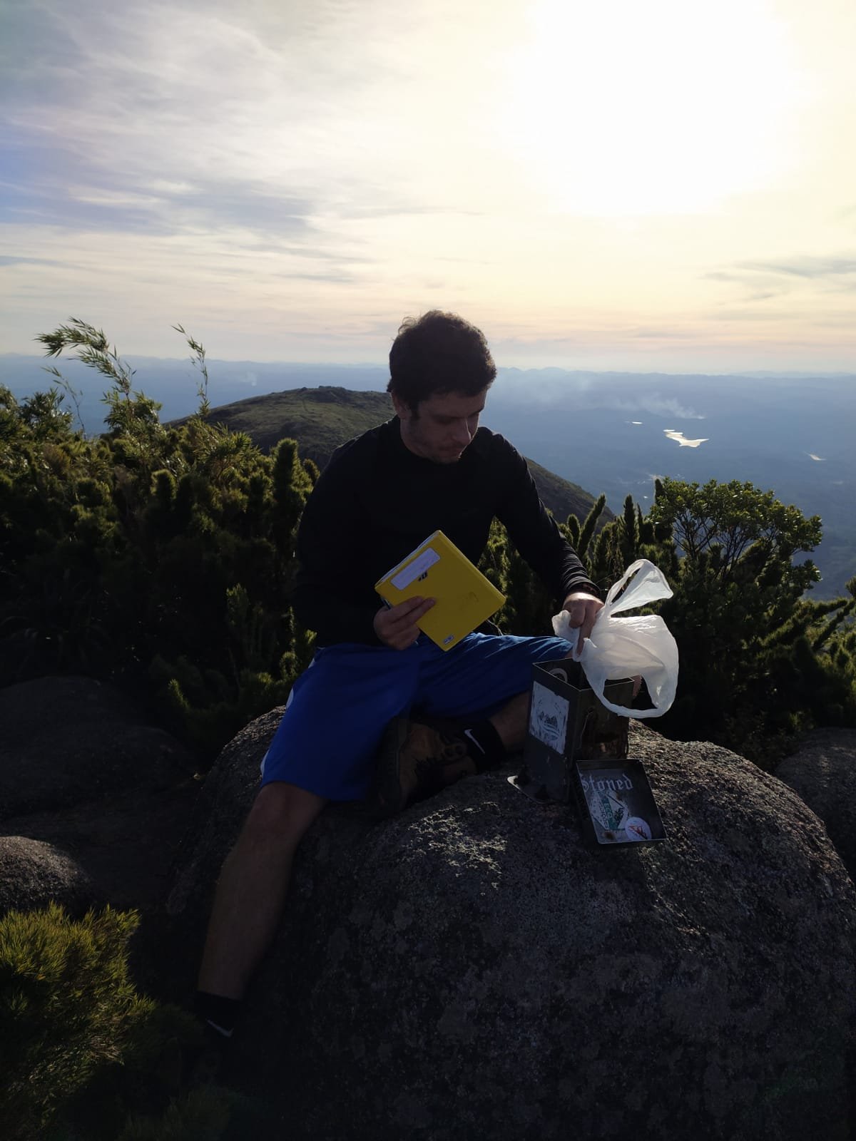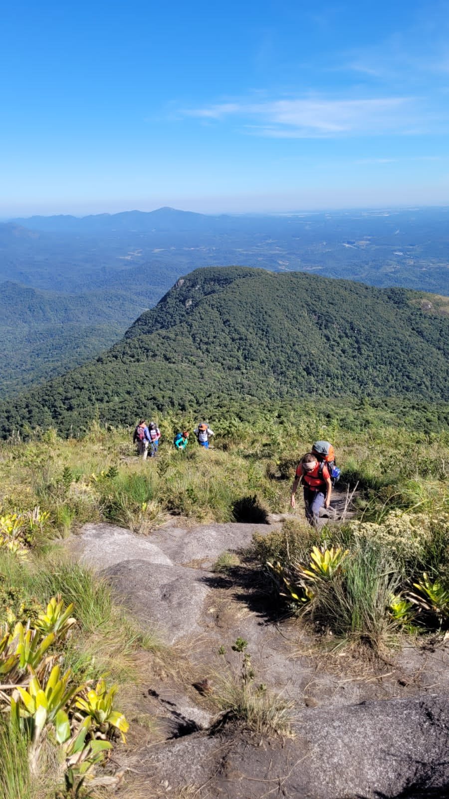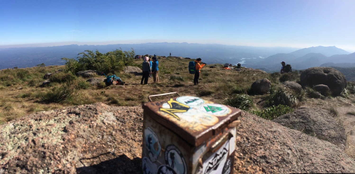 A volta é mais rápida, porém mais complicada em alguns trechos, na descida do Tucum tem uma parte no paredão de rocha que pode precisar de ajuda caso a pessoa não esteja tão confiante, mas nada de anormal, só ir com calma e cuidado que dá tudo certo. Entre descer o tucum e subir pro camapuã levamos 40min, chegando lá alguns assinaram as folhas do livro que estavam na caixinha, incluso yo, somando mais dois livros nessa trilha, agora com mais calma andei um pouco pelo Camapuã e é bem legal lá, Tucum é mais bonito, tem uma vista mais abrangente, mas o Camapuã serve muito bem para um camping, enquanto o pessoal tirava fotos eu fiquei lagarteando em uma pedra até a galera decidi descer. Encontramos muita gente subindo o Camapuã no domingo de manhã, pessoas de todas as idades, o famoso dia da farofa, galera simpática, acabei dando uns 300 bom dias nessa trilha viu; foi super tranquilo descer a rampa do camapuã, a panturrilha é bem acionada nessa volta, mas todos foram super bem.