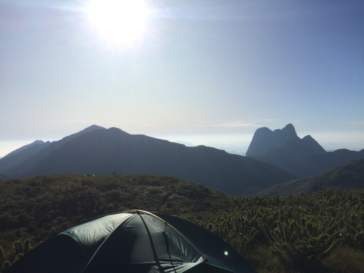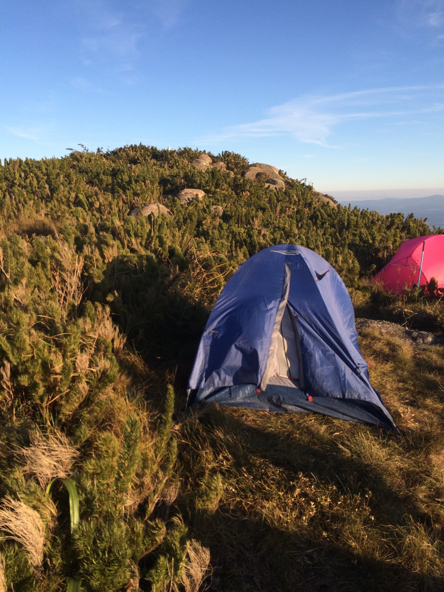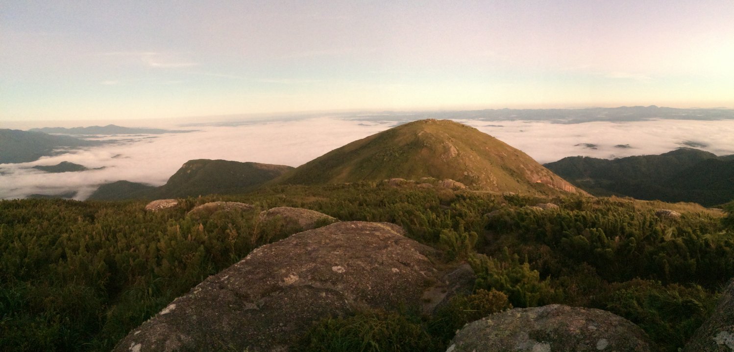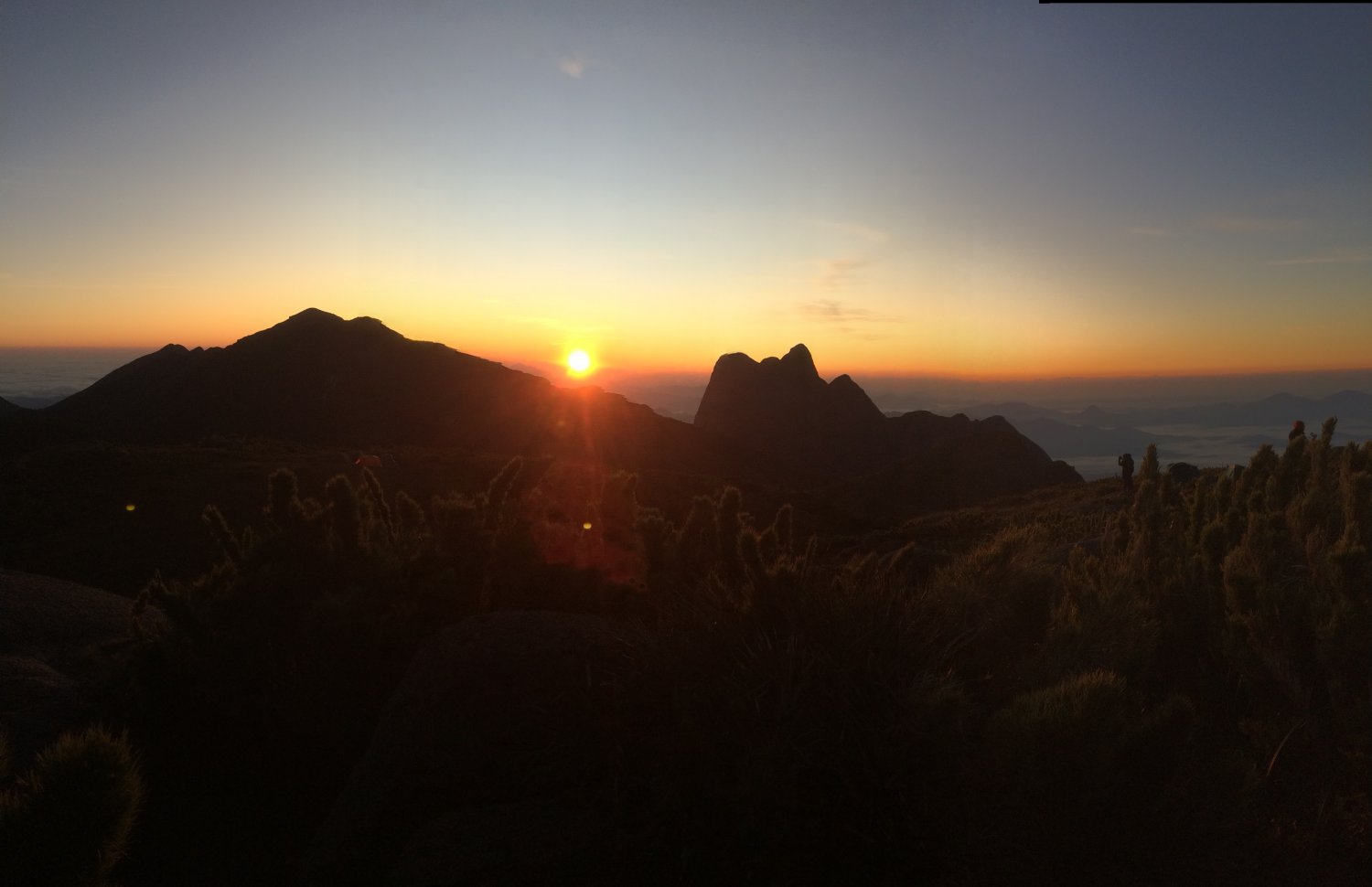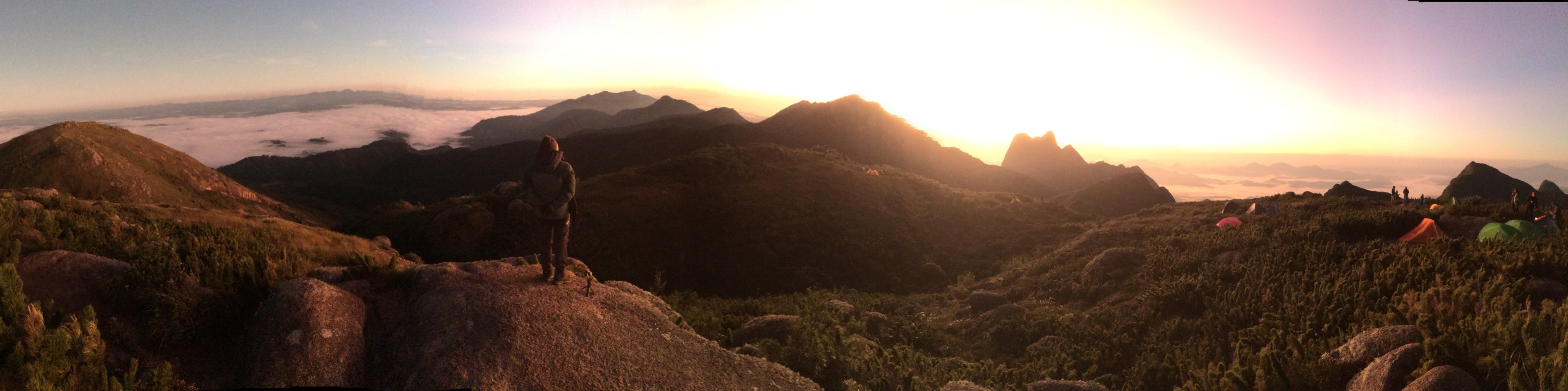 Às 6h já estou desperto pra ver o nascer do sol, não dormi perfeitamente bem pq no lugar que a barraca estava eu tinha meio que ficar numa posição de tetris pra me sentir confortável, o que não era fácil, pela manhã faziam 2°c, a menor temperatura da noite, quando os primeiros raios de sol vem varrendo os ventos gelados do fundo dos vales, a princípio fiquei vendo dentro da barraca mesmo pq tava um frio da poha! Mas logo sai pq quem tá na chuva é pra se queimar, me impressionou muito a semelhança do PP e do conjunto de montanhas ao redor com a própria Pachamama, a silhueta do PP sendo o rosto e as montanhas do redor o restante do corpo, nas fotos fica bem mais claro, o interessante é que de cada pico daquele que tu estiver o PP vai ter uma aparência diferente. O nascer demorou um pouco, já eram quase 7h, de onde eu estava consegui ver ele perfeitamente, aquela bola de fogo nuclear criando forma mais uma vez no horizonte num espetáculo que se repete dia a dia desde o alvorecer dos tempos, no cume tinha um cara que estava filmando o nascer e enquanto isso conversamos uma prosa e ele me ensinou demais sobre as montanhas de lá e de todos os outros conjuntos ao redor, o cara já tinha feito quase todos os picos da serra, foi dando os nomes, contando histórias, macetes, era basicamente tudo que eu queria saber, conjunto PP, Marumbi, Pedra Branca, Morretes, Porto Paranaguá, Ilha do Mel, Curitiba, Cont.do Cerro Verde, aí foi me falando e explicando alguns pontos, depois dessa aula descemos e cada um foi arrumar suas coisas pq ali o tempo voa acelerado.
