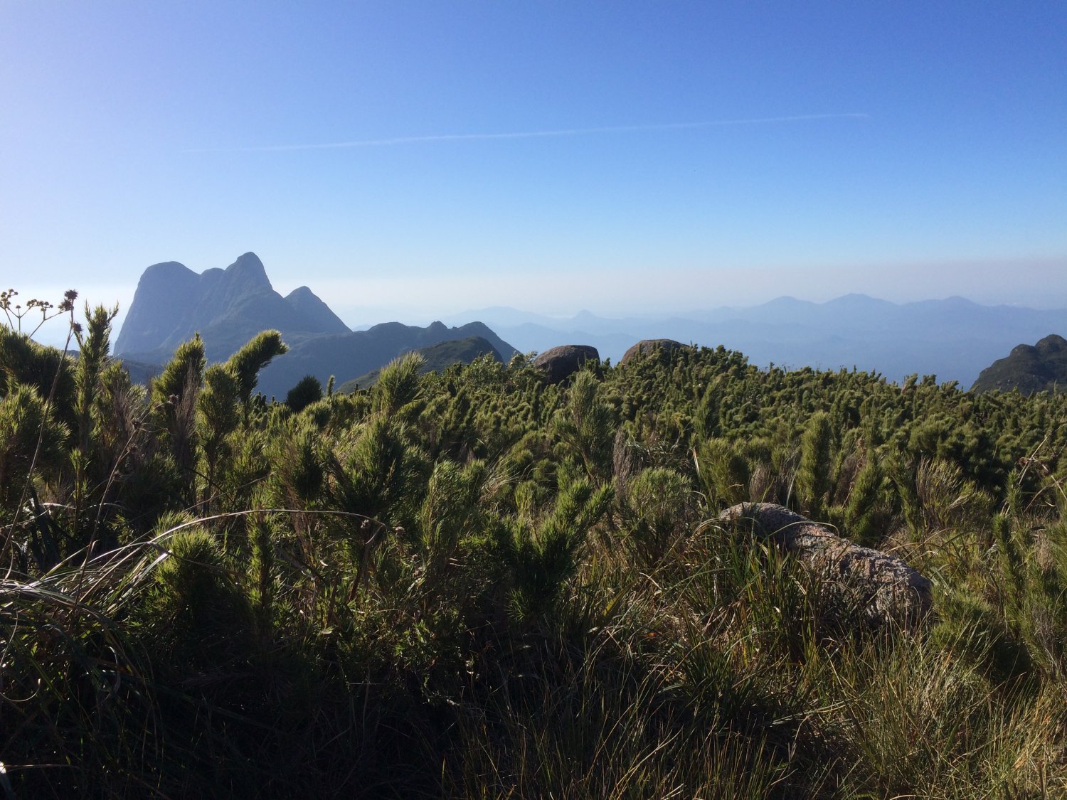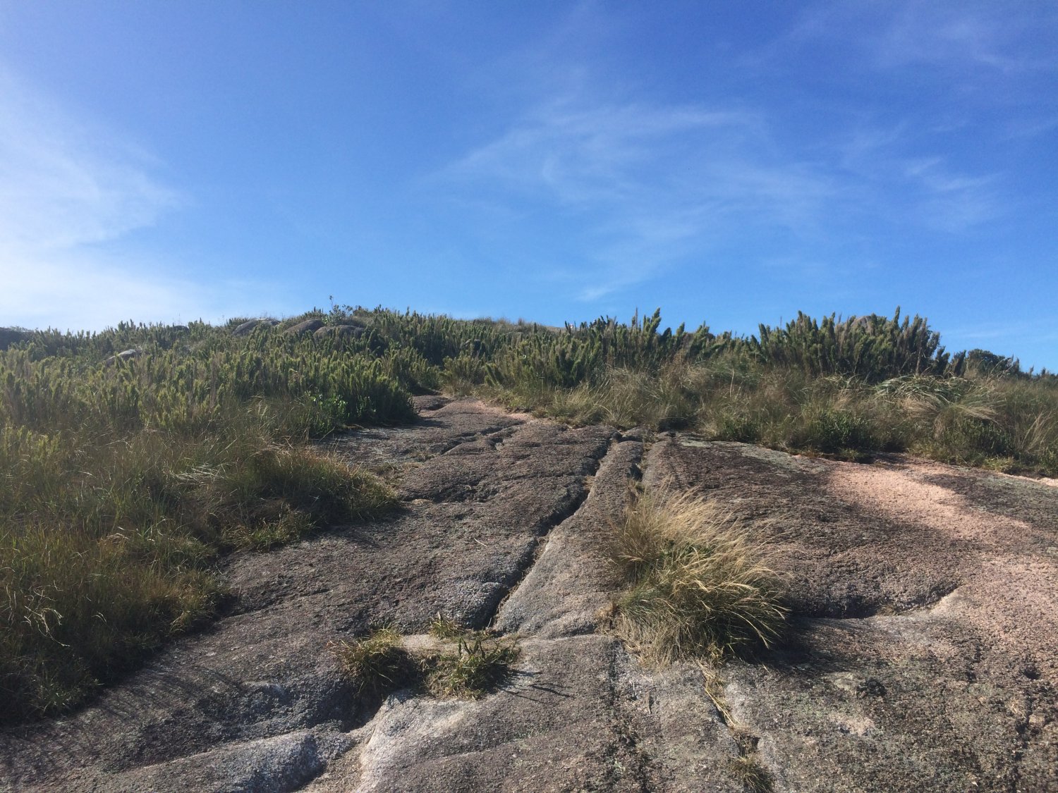 Eu mesmo gostei quando chegou nessa parte, porque já estava cansado das raízes, pisar num pouco de pedra faria bem, pois ali fizemos nossa primeira parada boa mesmo, pessoal sentou pra comer e olhar melhor um pra cara do outro, a visão dali já é pra mais de linda, morros e picos pra todo lado que se olha, o complexo Marumbi, Curitiba e o rio Capivari estavam perfeitamente visíveis nesse dia de céu limpo em Campina Grande. A rampa é longa, é um caminho de pedra em meio à vegetação, dá inclusive pra subir por ela nos trechos mais inclinados, inclinação essa que fez alguns sentirem mais a subida, porém parar pra respirar ali era só uma desculpa pra apreciar mais um c’adinho aquela paisagem, fomos conversando, contando causos e histórias, bem de boas e sem muita pressa, ao total foram cerca de 45min de pedra, sol pegando, mas me sentia muito bem por estar ali, ao ver as caratuvas já me toquei de que estávamos chegando, e alcançamos o cume do Camapuã (1713m) que é bem amplo tendo espaço p/ muitas barracas em diversos lugares, ali foi a primeira vez que bati o olho no Pico Paraná (PP), ao longe, inconfundível e desafiador, por conta disso passei meio que batido pelo Camapuã, tirei algumas fotos do PP e com ele ao fundo,e bati algumas fotos pra Dani enquanto o pessoal ia prosseguindo na trilha e eu olhava de rabo de olho pra não perdê-los de vista, ali como na maioria das trilhas da região já bem demarcadas não tem erro, siga pela trilha mais batida, pois tem poucas bifurcações pelo caminho. A descida pro selado que levaria até o tucum me preocupava um pouco pelo impacto que teria, mas saquei do bastão de caminhada e meio desajeitado fui indo, logo cheguei na parte baixa, com o pessoal á toda subindo pra valer; á esquerda por entre grandes pedras tem um ponto de coleta de água, mas estava bem fraquinha e só tinha alguma água empoçada, então esquece…
