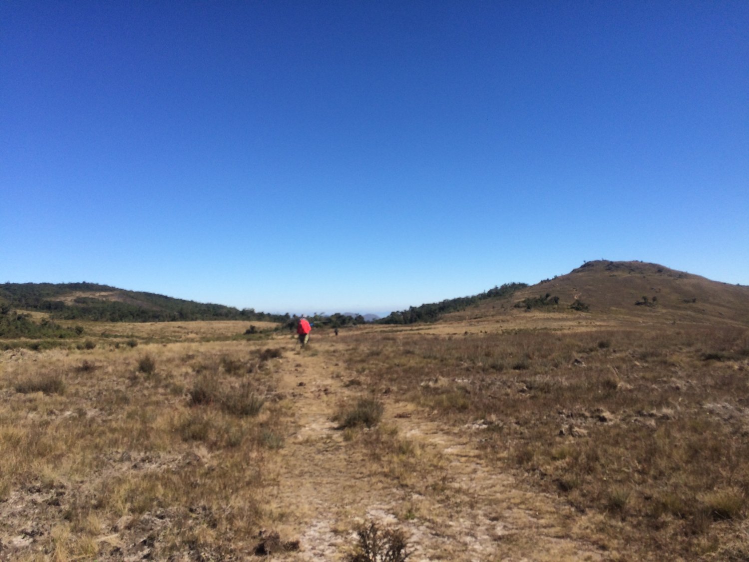 Sai por volta de 6h35, acompanhando a última trupe, que tinha o Marcelo, Anderson e Danilo, por coincidência, todos do CEU - Centro Excursionista Universitário, todos da USP, a trilha inicia na Cachoeira dos Garcia (na altura dos 1650m); a cachu tem uma queda d’água grande, mas da cabeceira não deu pra ver muita coisa, o que deu pra fazer foi abastecer minha garrafinha com água geladíssima. À partir dali andamos por poucos metros em estrada de terra até subir à direita já na trilha, como tinha geado à noite, a relva estava branquinha e o capô de um fusca vermelho estava coberto de fina camada de gelo, posso dizer que esse início de trilha para mim foi bem duro, pois com o ar seco e gelado e a mochila com capacidade máxima, eu buscava o ar e ele não vinha, nisso acabei me distanciando um pouco dos caras pra poder me reabilitar melhor, fui buscando ar aos poucos e com alguma dificuldade fui melhorando conforme eu fazia breves pausas para recuperar o fôlego e continuava, mas o Danilo ainda estava atrás de mim, ou seja, a subida que a gente tava trilhando, que era o primeiro morro que venceríamos, não estava puxada só para mim. Enquanto isso, o sol já saia derretendo os cristais de gelo que tomavam conta da vegetação. Após vencer esse primeiro morro, fizemos uma breve pausa para esperar o Danilo, e encontramos o Davi e o Danilo (esse outro danilo), figuras que serão importantes daqui pra frente. O outro Danilo que estava conosco demorou a aparecer, ele já estava ficando pra trás, já nos atentando a esse detalhe, seguimos, agora minha respiração já se normalizara, e dali pra frente não teria mais problemas durante toda a travessia, foi mesmo uma questão de pegar no tranco já na quinta marcha.