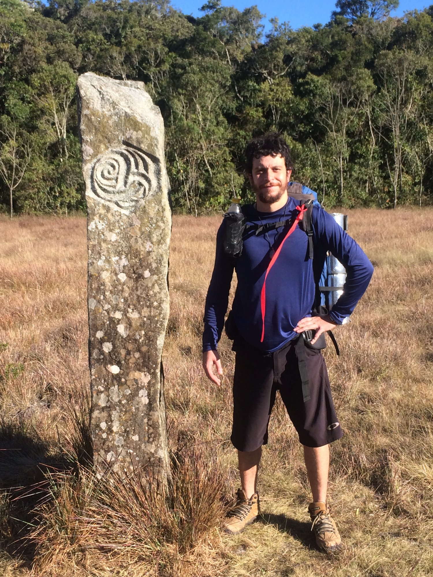 Seguimos viagem…O relógio marcava por volta de 15h e nos encaminhávamos para o final do dia, mas a pernada ainda seria longaa. Descemos um pouco e novamente começamos a adentrar por campos abertos e o peso da alça direita da mochila começava a me incomodar. No Vale do Matutu, que era onde estávamos, adentramos novamente a um desses campos abertos e nos deparamos com um tótem do Santo Daime; devido a uma comunidade que fica ali perto; esse totem de pedra fincado na terra simula uma agulha de acupuntura, colocada ali por um europeu que o fez em inúmeras outras partes do mundo, e escolheu aquele vale para receber tais energias, seu desenho em redemoinho é bastante místico e cheio de significados, transmitindo uma aura de respeito e admiração, ainda mais para mim que tenho um apreço especial por isso. Fotografamos o totem e continuamos a trilha, passando por uma placa que alertava sobre a presença de felinos na região…Bom nós que não temos nada a ver com isso só seguimos heheh, a trilha segue agora por um curto trecho sombreado que ajudou a refrescar a cuca, e sempre enquanto caminhávamos a conversa rolava solta, o nosso grupo se entrosou muito bem, éramos eu, Anderson, Marcelo e Sérgio. Nesse trecho há um outro ponto d’água que passa debaixo de uma ponte de madeira, água limpa naturalmente, mas nessa daí eu mosquei e não peguei água por preguiça de tirar a mochila e encher as garrafas, nenhum de nós parou ali, eu devia ter parado.