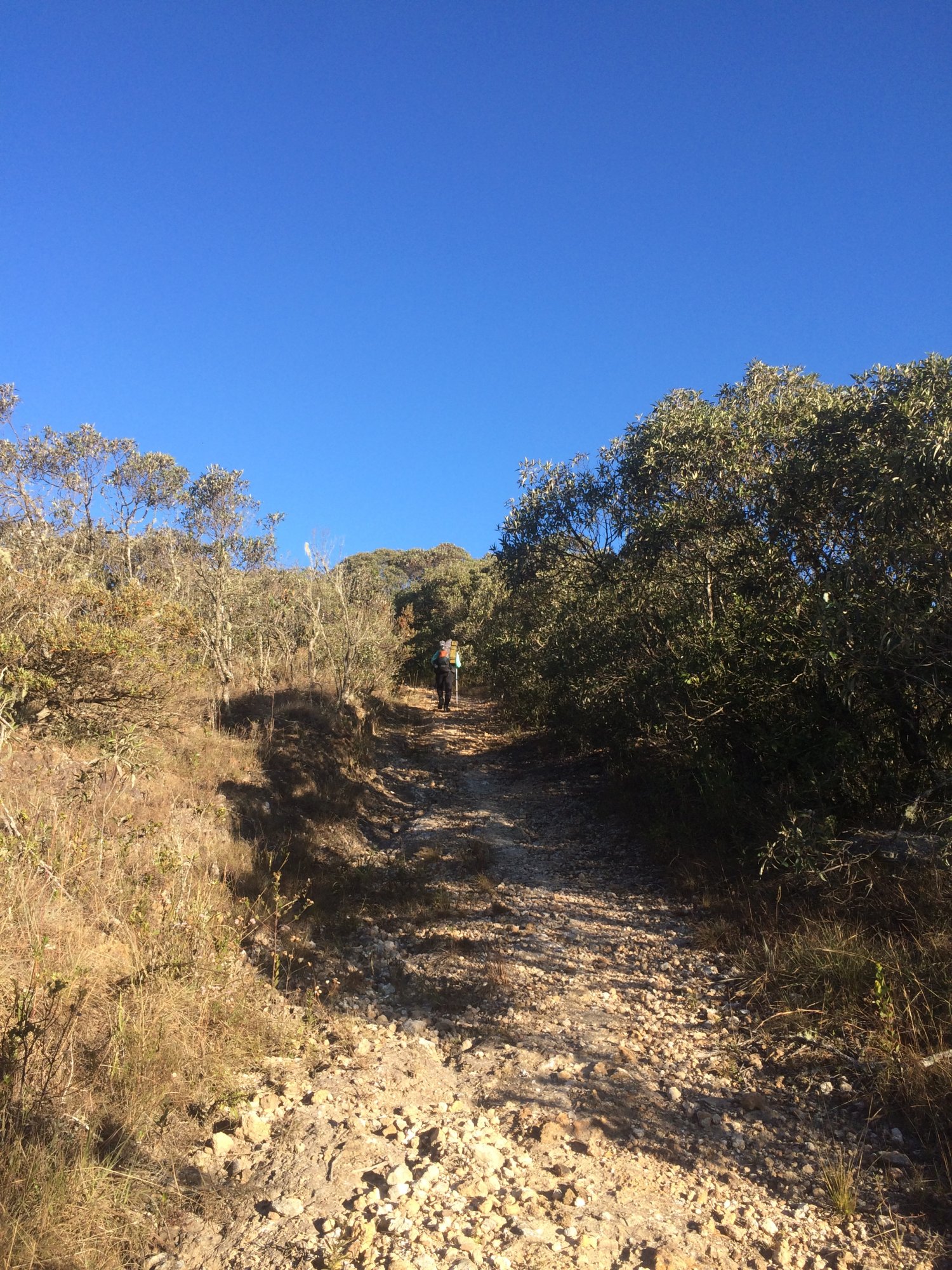 Desde o início da travessia tínhamos uma ideia em comum de que esse seria o dia mais punk, influenciados por relatos e alguns tracklogs, com certeza ninguém queria se decepcionar, mas também ninguém tava querendo se surpreender muito heheh. Reforcei o desjejum desse dia, com um panelaço de mingau de aveia com granola e bis, toda fonte de energia seria importante. Partimos às 8h20, desta vez toda galera partiu no mesmo horário, apenas o Danilo que ficou dormindo mais um pouco pra procurar carona para fora da travessia (e conseguiu, sem problemas); começamos subindo à direita do acampamento, e sempre que começamos subindo, já é prenúncio de um dia puxado. A mochila eu não posso nem dizer que estava mais leve, porque como nesse dia têm poucos pontos d’água eu enchi todas as minhas garrafas, totalizando 4l, ou seja, 4kg+ kkkk, só que o couro já estava amaciado, começamos subindo em fila indiana num ritmo mais cadenciado pra ir esquentando o sangue e em 10min passamos os casais, o peso exorbitante da mochila deles, entre 17 e 22kg faria esse dia custar caro, aliás os veremos novamente só na manhã seguinte.