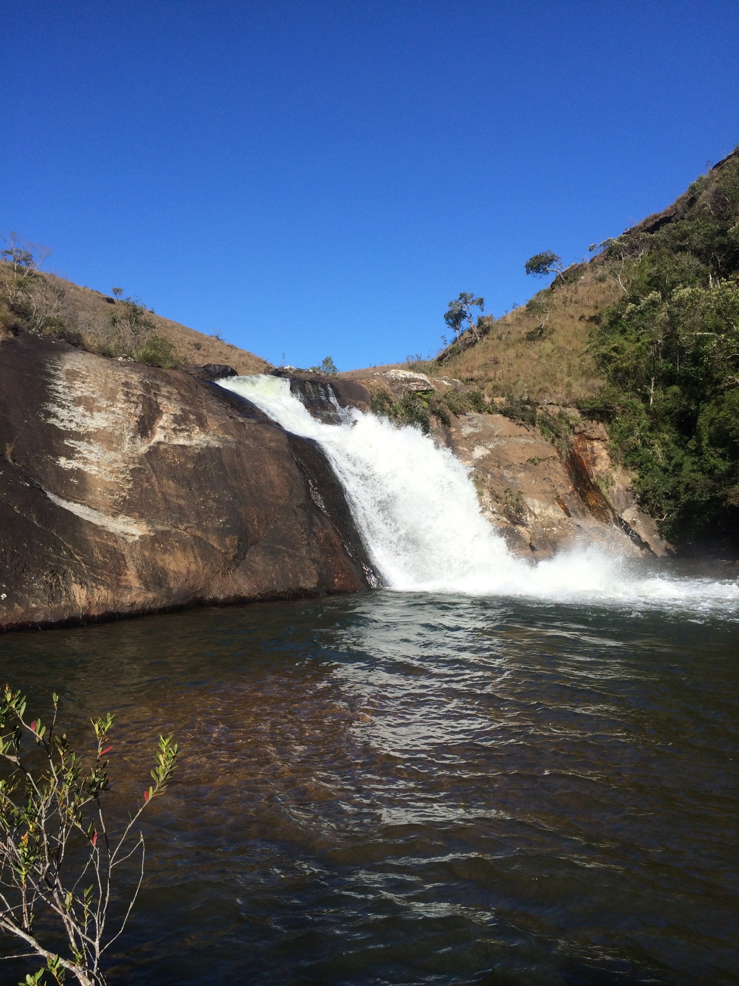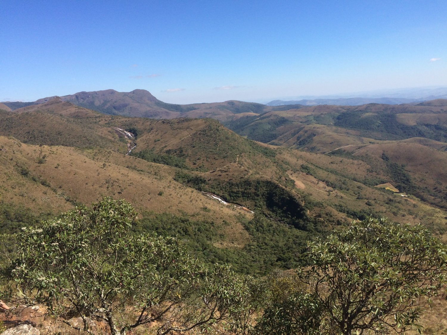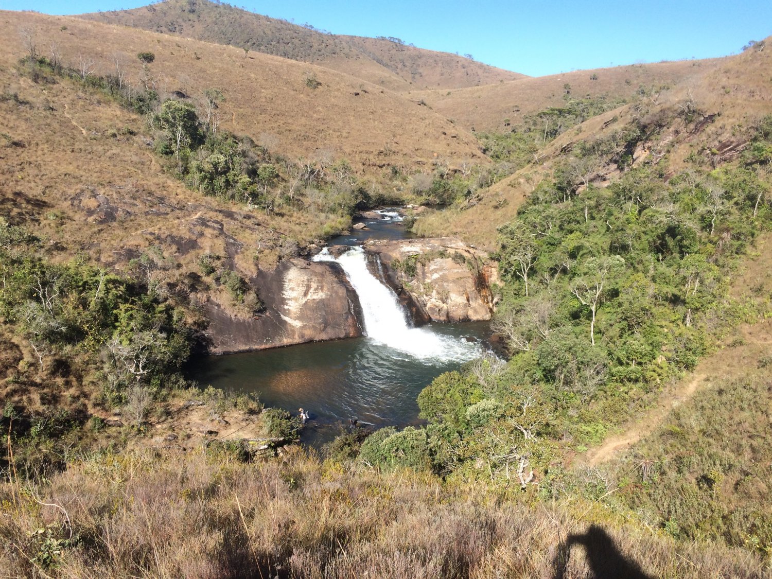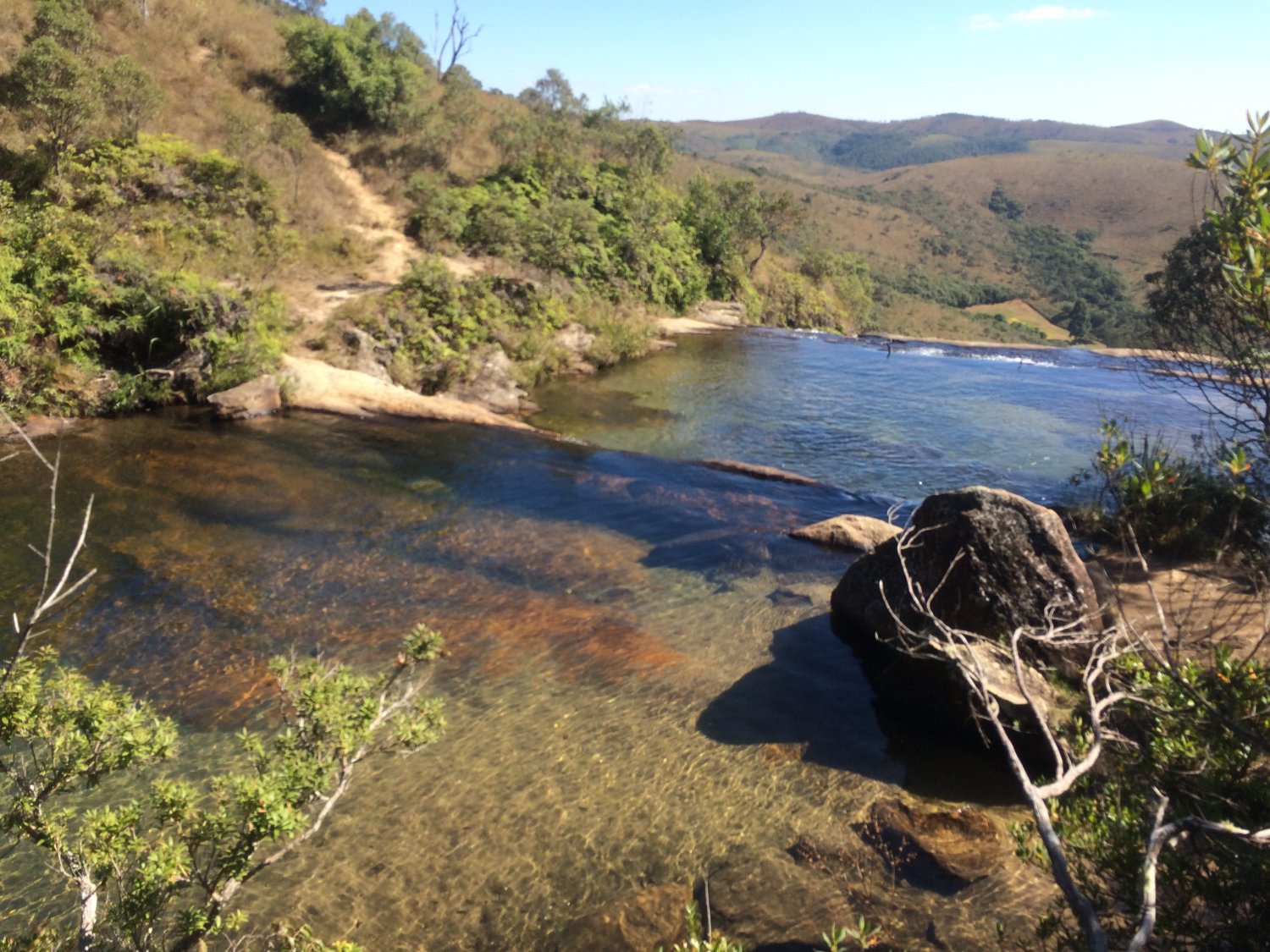 Seguindo por rápida trilha, chegamos à área de acampamento do Charco, onde também tem água (que nós pegamos), e tem um casebre de madeira. Davi e Danilo tinham acampado lá e já estavam despertos quando por lá passamos, ainda se ajeitavam para sair, sabendo que aquele dia seria de passeio no parque. Nós continuamos a pernada subindo pequenos aclives com trilha batida, entre vegetação seca, pequenas árvores retorcidas e paisagens que me remetiam às do cerrado. Ao longo da travessia, neste dia e trecho em especial, foi o dia em que mais encontramos outros caminhantes, sua maioria fazendo a clássica travessia da região, a Baependi x Aiuruoca, que nós já estávamos fazendo conforme percorríamos a transpapagaio. A caminhada prosseguiu bem e de forma tranquila, conosco papeando e aproveitando o dia de sol, vale ressaltar que mesmo o sol se fazendo presente a todo instante, não fez aquele calor abrasador; bem antes de chegar no Juju, encontramos um pequeno córrego de águas limpas e perfeito para reabastecer o cantil, por lá batemos uma água no rosto e seguimos. Subindo um pouco mais, passando por curto trecho de mata, temos na sequência a primeira visão da cachoeira do Juju, precedida por uma íngreme descida com grandes pedras que servem perfeitamente como cadeiras enquanto apreciamos a longa queda do rio gamarra se espraiando pelos verdes vales da serra do papagaio.
