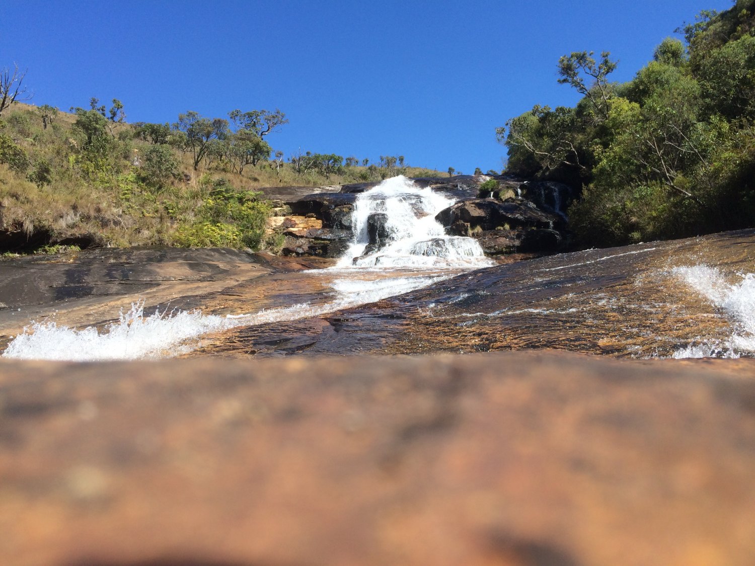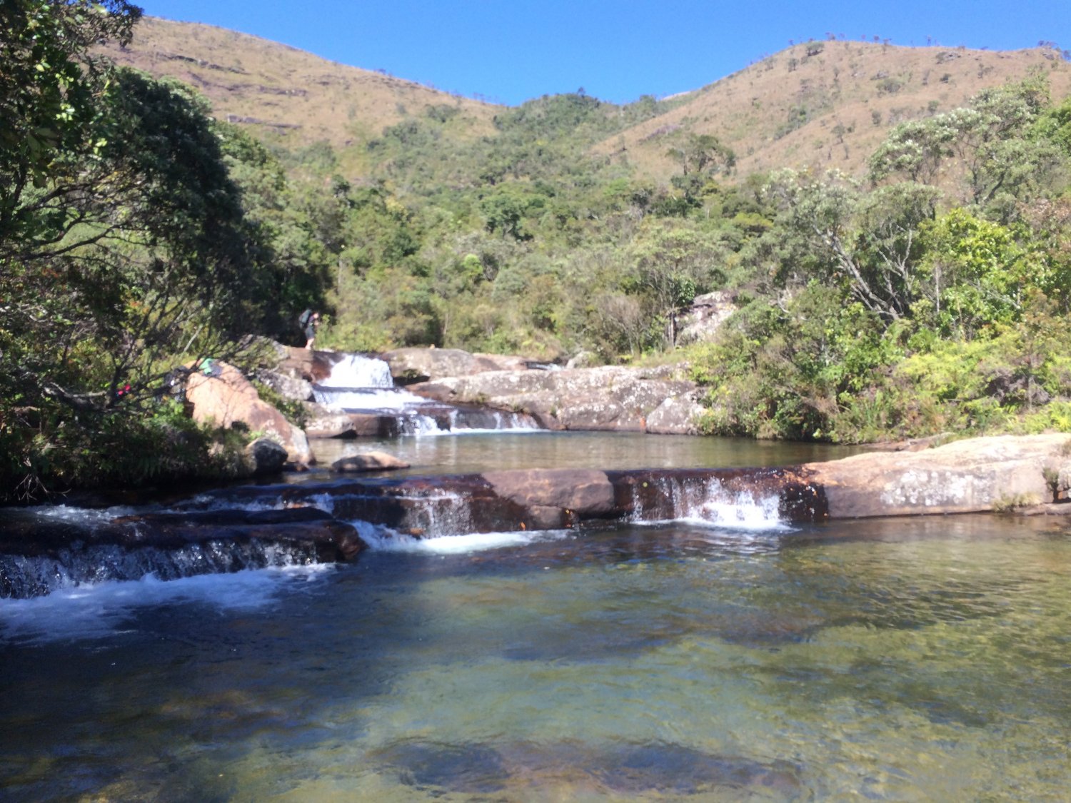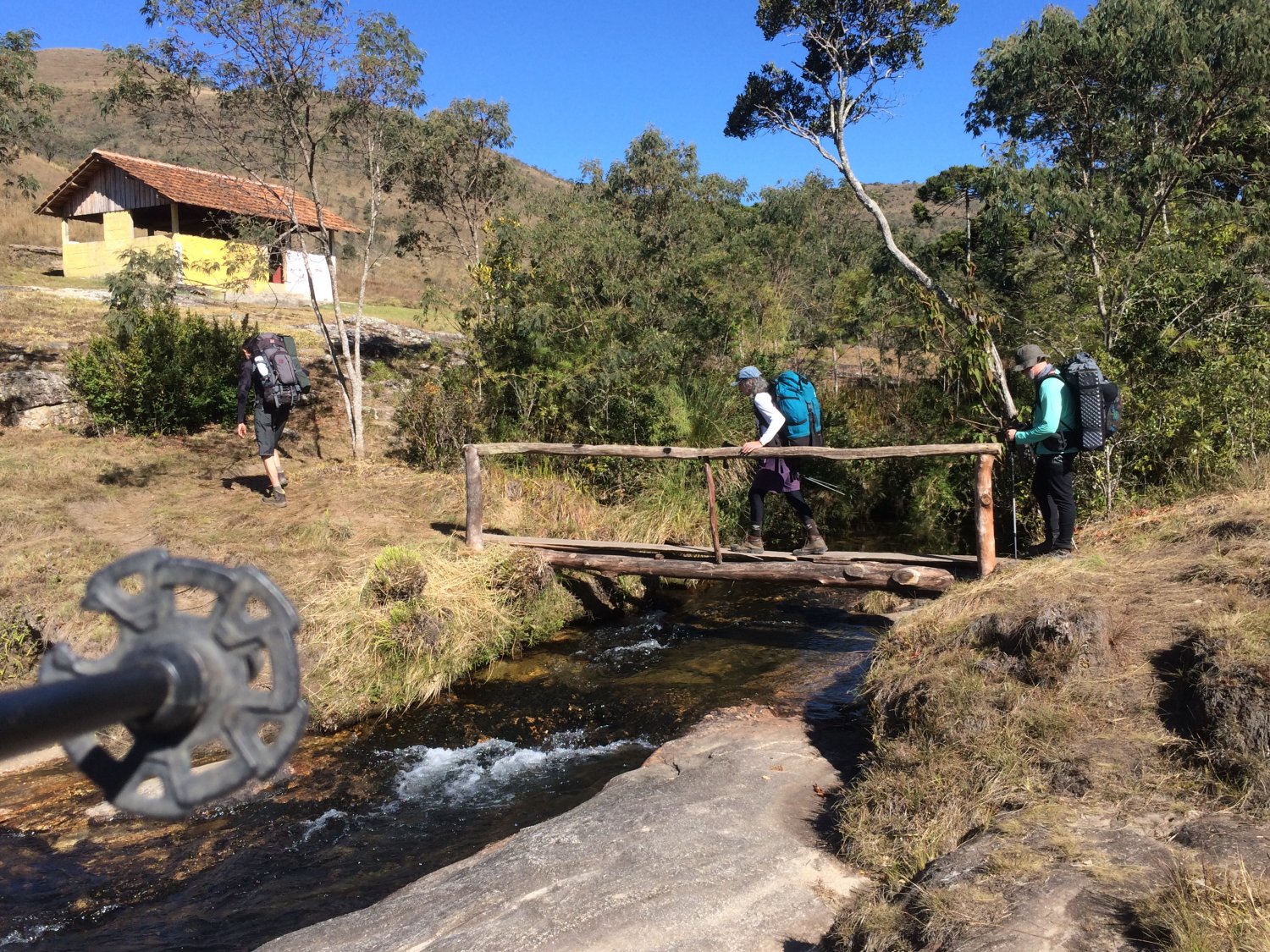 Após mais de três horas de caminhada num ritmo bem tranquilo, chegamos à Cachoeira do Juju, em Baependi, local bonito pra valer! São três piscinas naturais de águas cristalinas, a primeira menor e mais rasa, a do meio a maior e “mais funda”, com uma quedinha d’água bem gostosa, e a último é a jóia da coroa, com um fundo de areia fofinha, dava pé em todo lugar, ou seja, zero risco de afogamento, além da borda infinita que dava aquela sensação de que “É pra isso que eu venho de tão longe” heheh. Lá eu me esbaldei, nadei, fiquei encostado nas pedras, tomei sol, fiz o que tinha direito kkk, acabou que o pessoal quase todo entrou e aproveitou também, porque o dia estava perfeito!. Ainda na saída encontramos uma galera que tinha vindo dos chalés e hospedagens que tem ali logo abaixo e trocamos um papo, a galera fica sempre curiosa quando vê um mochilão. Além do mais, ali bem do ladinho da água tem local para acampar e é um dos locais mais privilegiados de toda a travessia. Curtimos muito e fomos seguindo trecho explorando outras quedas um pouco mais pra cima, e logo se descortina para nós um grande escorregador, uma laje inclinada e de pedra bem lisinha por onde aquela água passa a sabe-se lá quantos séculos ou milênios, sua cor mesclava laranja e dourado desaguando num poço com tons de verde, coisa mâi linda! Como bem disse o Anderson, sempre que tem água é legal, todas aquelas cores vivas emolduradas pelo céu azul sem manchas faziam o sorriso brotar no rosto com facilidade. Ao subir pela trilha que ia margeando as quedas, voltamos à trilha principal, admirando e conversando sobre a paisagem que estávamos defronte, com serras e montanhas sobrepostas. A trilha segue bem batida, com mirantes à direita, onde acompanhamos a queda do rio Gamarra, que é deslumbrante. Logo à frente uma placa indicava a direção do abrigo, e uma caveira de cavalo indicava nosso futuro; à caminho do abrigo passamos pela bifurcação para o Pico do Chorão, mas seguimos reto para o Rancho do Salvador, que se apresentou a nós como outro lugar mágico, uma charmosa pontezinha de madeira nos permitiu acessar a área de camping que era precedida por um manso rio que serpenteava por entre as pedras, esse trecho do rio me fez lembrar das cenas de filme onde as mulheres lavavam roupas à beira de rios e riachos, certamente era um cenário de filme (e não de terror kkk). Entre a Cachoeira do Juju e o Rancho do Salvador demoramos 40min, bem pertinho.