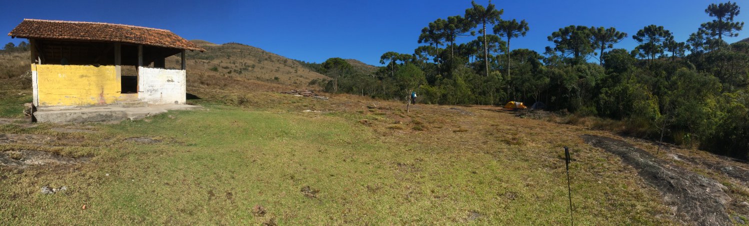 O rancho tem um abrigo, que é uma casinha amarela e branca, toda rabiscada pelos que lá frequentam, pelo que fiquei sabendo ali passou por uma reforma e sim o telhado está inteiro, devendo servir ali para que os trilheiros se protejam da chuva, para que façam um bivak, e principalmente para cozinhar, já que possui um fogão à lenha, tendo carvão e lenha cortadas, pelo menos dessa vez tinha. Boa parte do terreno em torno é plano, e quando chegamos lá por volta das 13h40, só tinham duas barracas montadas, pudemos então escolher os melhores lugares, ficamos numa área sombreada protegida pelas araucárias e rodeados por bancos e uma mesa de madeira, logo atrás ficava uma parte de mata, e o rio que servia tanto para tomar banho, quanto para nos abastecermos de água, ou seja, um acampamento perfeito, com certeza dos melhores que eu já fiquei, em questão de minutos já me sentia em casa. Aos poucos a galera foi chegando, primeiro Danilo e Davi, depois os casais, que lamentaram termos pego “os melhores lugares” kkk, paciência né. Apesar de termos chegado cedo, o tempo voava batendo asas, até que o Marcelão se animou e disse que ia atacar o Chorão, fiz coro à essa ideia e da nossa trupe todos fomos, exceção feita ao Danilo. Em questão de minutos (7 min), subimos ao Pico do Chorão (1800m), a vista de lá como tudo nessa travessia, é sensacional, conseguimos ver boa parte da serra do papagaio; lá encontramos os Ituanos, (Denis e Roger, dois amigos de Itu que fizeram conosco a travessia), e ficamos papeando sobre montanhismo, manejo de áreas e parques, turismo no Brasil e por aí vai…São sempre temas ligados ao montanhismo e trilhas, trocar experiências com essa galera é um privilégio, do alto do chorão ficamos contemplando o horizonte e curtindo a brisa, mas não ficamos para ver o pôr do sol, descemos antes.