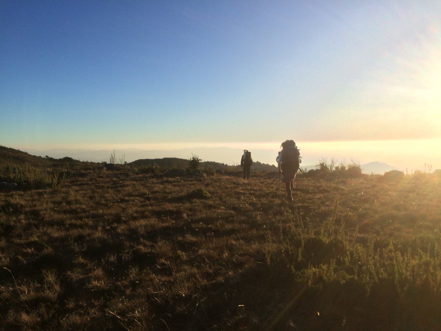 Só que não acamparíamos ali, para adiantar a caminhada do dia seguinte o Danilo vinha propondo que o acampamento fosse montado mais á frente, acampar ali no pico seria o ideal, mas a pernada do dia seguinte ia ficar mais puxada, por unanimidade decidimos que sim, íamos mais á frente. Caminhamos sentido sudoeste, passando pela antena que fica no maciço do pico e seguimos, o dia tinha sido extenuante e era normal estarmos todos cansados, o sol já ia se pondo e a imagem dos trilheiros caminhando em direção à ele era nada menos que mágica. Como estávamos alto, daria pra aproveitar sua luz até o fim, o objetivo era chegar à área de acampamento antes do escurecer, tendo em vista que só o Danilo conhecia o lugar, pois já estivera lá quando fez a travessia anteriormente, vez ou outra quando avistava um lugar mais plano, perguntava nos se não queríamos acampar por ali, mas não, a ideia era ir até onde ele já conhecia, não tinha porque pararmos antes, afinal missão dada é missão cumprida e o dia ainda não tinha terminado. Ao largo de mais 1h de caminhada desde o Agostinho, chegamos ao local de acampamento, uma área com grama um pouco mais ralinha, chegar lá foi um alívio geral, cada um escolheu um lugar pra montar a barraca, Sérgio na dele, Anderson e Marcelo dividindo uma Mykra Aztec, o Danilo e Davi numa espécie de tarpe ul, os protegendo de uma bivaque. Quando chegamos o sol estava já se pondo, só deu tempo de montar mesmo, enquanto a gente montava deu pra assistir um pouco o pôr do sol, pra não dizer que não assistimos nenhum heheh. O meu ritual foi o mesmo do 1° dia, montar e esticar a barraca, cair pra dentro, trocar de roupa, esquentar a água pra fazer o rango, que no meu caso foi macarrão com atum, o clássico dos clássicos, a água esquentou rapidinho e em 15min já tinha acabado com tudo. Ai sim finalmente o espinhaço deitava, ufaa! Que maravilha! Só na trilha mesmo para que eu durma 19h30 kkk, é um mundo à parte, são dias dentro de uma outra realidade, uma realidade que eu adoro, agora sim o dia estava concluído. Nesse dia andamos cerca de 19km, em 7h35 de caminhada, sem contar as pausas.