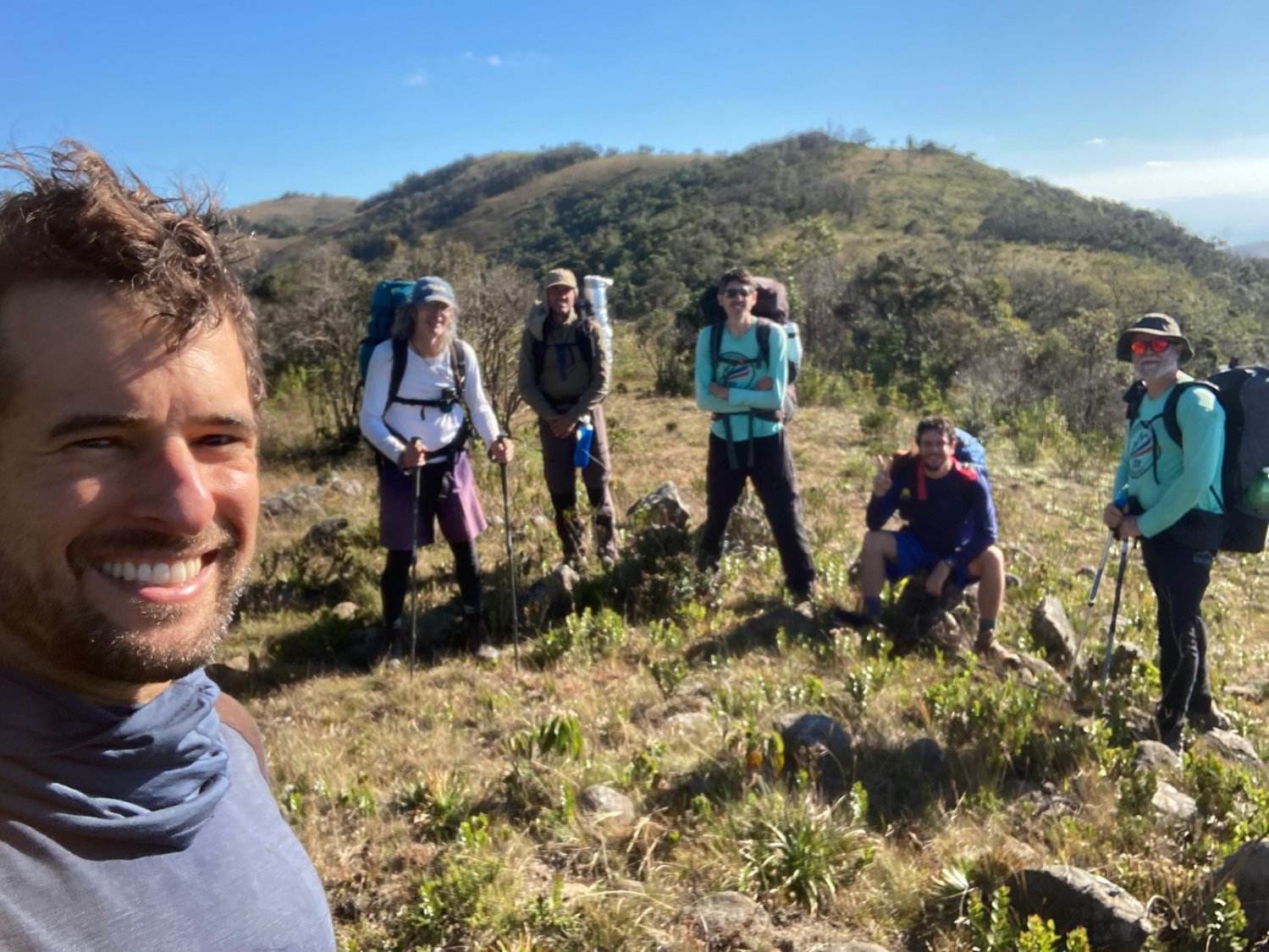 A trilha segue por dois morros de rocha, onde seguimos buscando caminho por entre elas, já numa subidinha um pouco mais íngreme onde a aderência nos pés é fundamental. Logo depois chegamos a uma área de planalto e campos abertos, caminhando em nível a pernada sempre rende mais, podendo assim caminhar mais perto um do outro, com o Marcelo já se destacando na frente. Naquele momento o Danilo e o Davi deram um estirão e foram simbora; vale ressaltar que eles estavam ultraleves, com mochilas pesando em média 6 kg; pra mim isso é um sonho distante kkk mas um dia chego lá; e nós ficamos na nossa, andando no nosso ritmo, nesse momento o Sérgio, nuestro hermano Argentino, tinha escolhido andar conosco, talvez porque tenha ido com a nossa cara ou porque viu que o nosso ritmo estava mais compatível com o dele, àquela altura as equipes já estavam formadas.