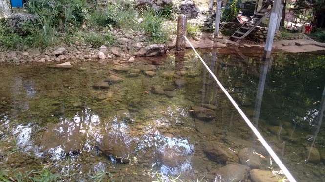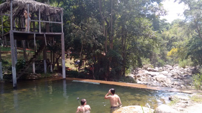 O camping tem uma estrutura muito curiosa. Na propriedade se passa um rio, e o dono (Dioney) fez um pequeno desvio e nesse desvio uma barreira, formando assim uma piscina. Do lado da barreira uma estrutura em madeira. Essa barreira é funda, dando até pra pular da estrutura de madeira sem medo.