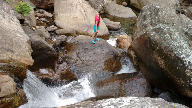 Depois de apreciar continuamos descendo a trilha agora de pedras. Nesse ponto é preciso um pouco de coordenação motora e bastante atenção. O caminho tem muitas pedras soltas e quedas as vezes grandes o suficiente pra se machucar feio caso voce escorregue e caia por la.