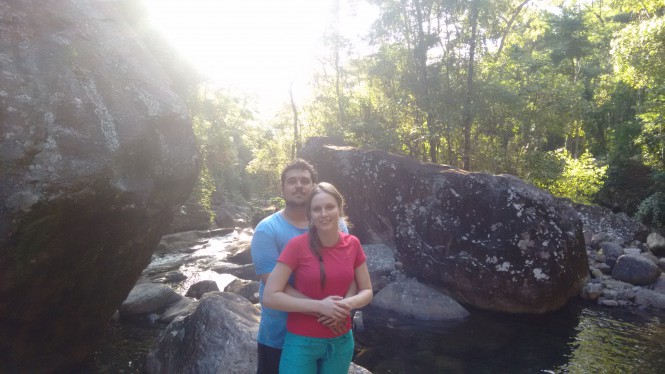 Após nosso almoço, demos uma descansada e ja descemos pela trilha sinalizada ao lado do banheiro. Depois de uns 100 metros de descida de trilha chegamos ao primeiro poço. A agua cristalina é realmente muito bonita, da pra se ver o fundo de pedras. A agua é bem gelada, mas não tanto para nos impedir de entrar. Esse primeiro poço embora não pareça é fundo e da até para arriscar uns saltos do alto da pedra.