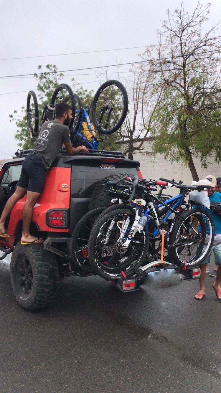 Por pouco, um cabo de telecom que estava estirado de um poste a outro quase acabou com nossa viagem antes mesmo dela ter começado. Isso porque quando saíamos do condominio, já com as bikes no teto do carro, uma delas acabou enganchando no maldito cabo e arrancou, sim, arrancou o rack de teto do carro e a bike ficou parcialmente pendurada no fio. Por sorte e precaução, havia levado uma fita (daquelas de caminhoneiro) como backup. E o backup se tornou o novo rack kkkk. Perrengue resolvido e lá fomos para FSA com as bikes amarradas no teto do carro, fazendo um barulho infernal, mas semi-confiantes de que elas não soltariam no meio da BR324.