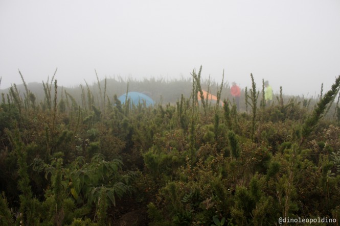 Montamos acampamento no cume sob um solo que mais parecia uma trança de raizes e outros extratos vegetais lamacentos - quase um charco. Os specs da barraca não ficavam bem firme então usei meus bastões para reforçar as duas principais cordinhas. Pelo menos o chão era fofinho xD.