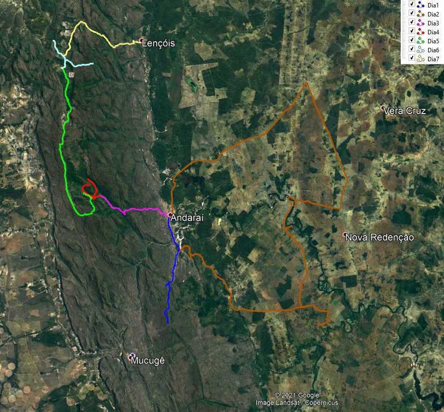 Rota completa realizada segmentada por dias (cada cor um dia distinto). A a rota em marrom foi realizada de carro com um guia local que contratei.