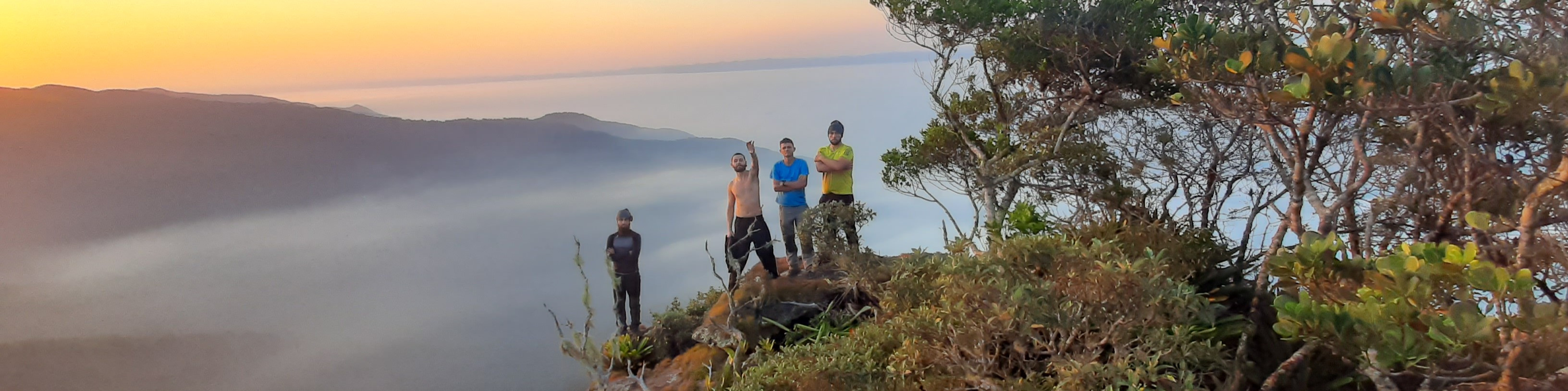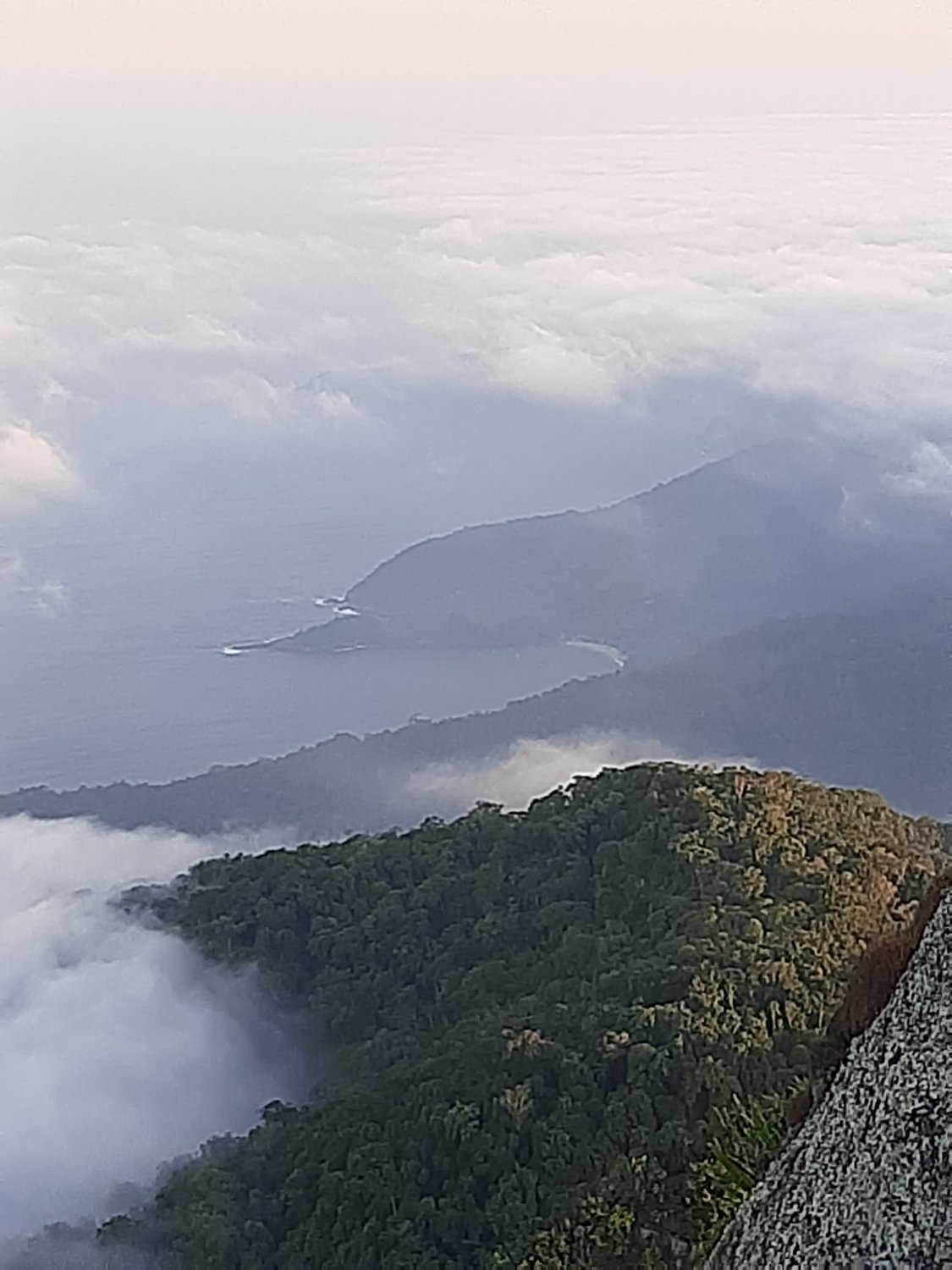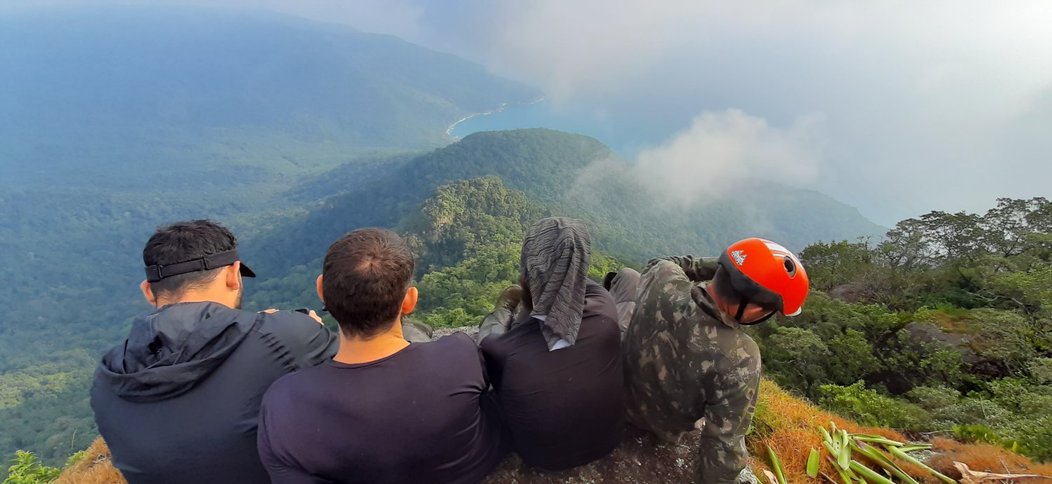 Lá pelas 4 da tarde começou a correria e aqueles que estavam no buraco, saíram feito ratos da toca. A montanha urrou e nos chamou, pediu para que nos sentássemos, tomássemos os nossos lugares porque o ESPETÁCULO iria começar. O tempo começou a abrir, a névoa ficou reta como um mar de gelo. Sentados na pedra do cume, hipnotizados pela sena, ninguém arredava pé e o Morro da Serraria (1257 m) surgiu imponente, mostrando seu gigantismo como a dizer e a nos mostrar quem é que manda naquela parte da ilha. Cada balançar das nuvens, uma nova paisagem, e logo fomos obrigados a correr para a parte leste para ver surgir a Praia da Serraria e o amontoado de barcos caiçaras na baia e mais além, a Ilha dos Búzios e da Vitória, nos faz sonhar com aventuras mais distantes.