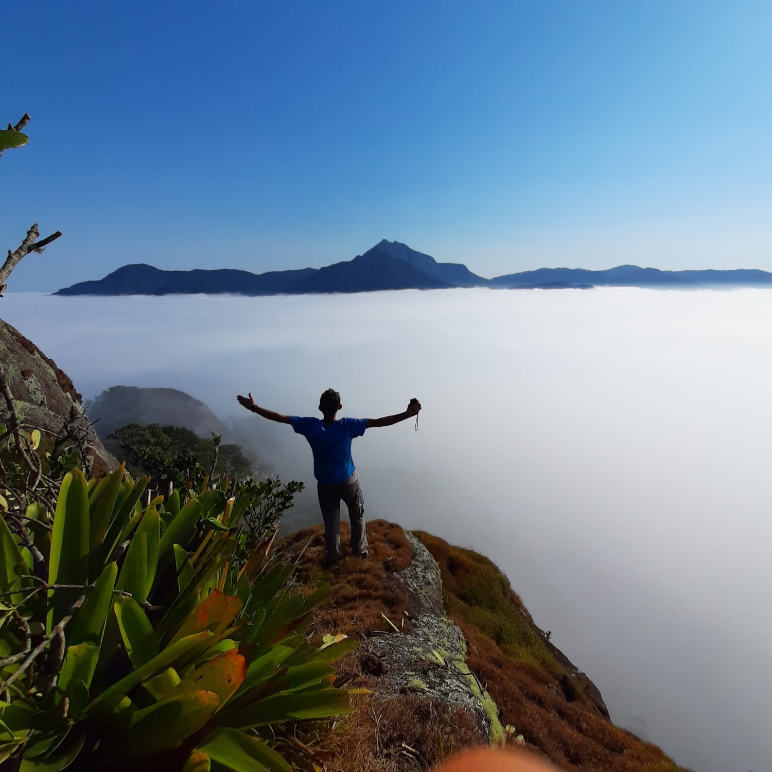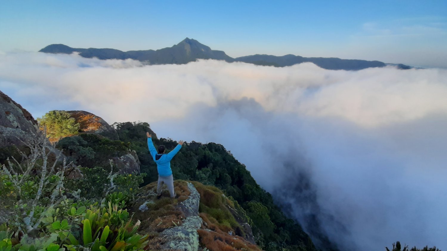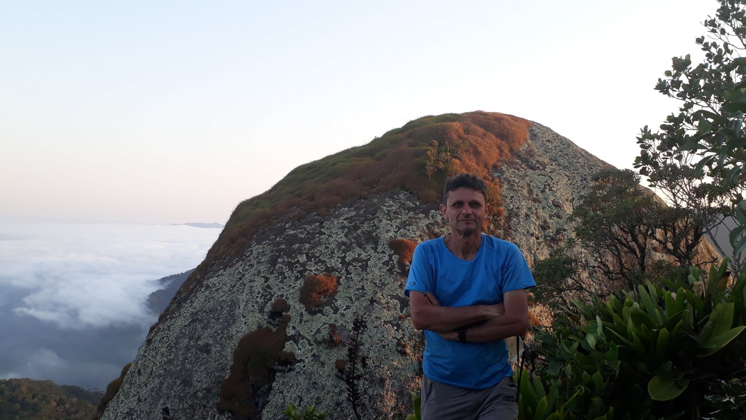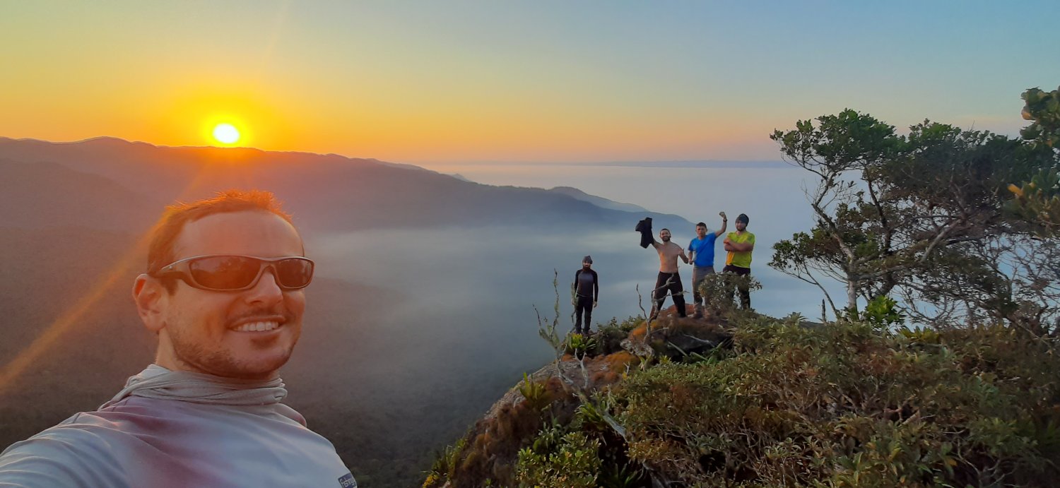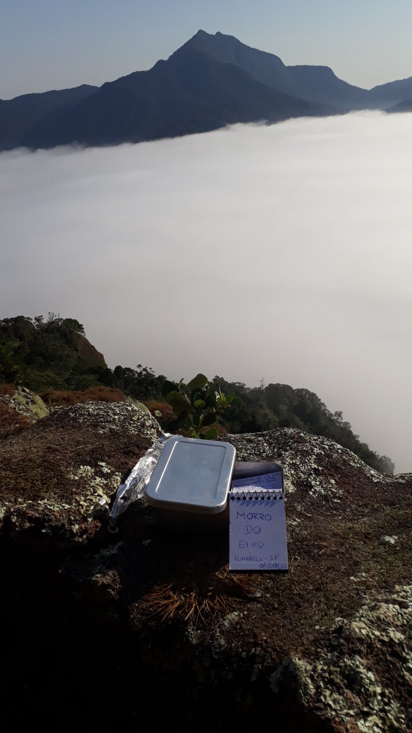 Amassando samambaia, percebemos que estávamos numa rampa de uns 5 metros de largura, não mais que isso, que parecia nos conduzir em direção ao cume. Ao lado dessa rampa, abismos dos dois lados. A cada passo, a cada metro vencido, um sentimento diferente vai tomando conta do grupo. Cada qual tenta conter a sua ansiedade, cada um com suas angustias interiores, querendo saber se vamos chegar ao cume ou se vamos dar com os burros n’água. O terreno vai se afunilando, uma névoa cobre o horizonte, mal conseguimos enxergar nada lá de cima, principalmente para o norte. Agora nem existe mais grupo, é cada um por si, quem tem folego continua, quem não os tem, se sustenta em suas próprias pernas, tentando buscar a última barra de energia que lhe falta. Um degrau de quase 2 metros nos obriga a fazer uma escalada nos valendo de umas moitas de bromélias, até ganharmos o estirão final, caminharmos por uns 50 metros até não existir mais mundo para a gente pisar e no dia 05 de setembro de 2020, o lendário MORRO DO EIXO acabara de ser CONQUISTADO.