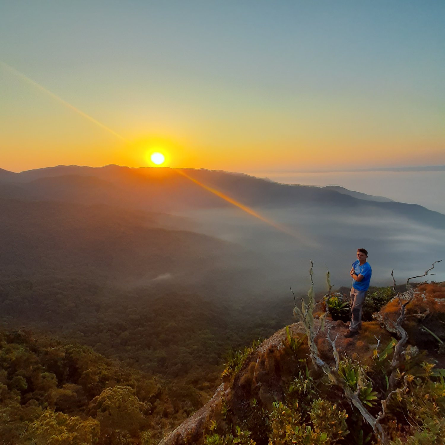 Perto das 6 da tarde já não haviam mais nuvens sobre o Morro da Serraria e o astro maior se apresentou para o show. Um sol alaranjado começou sua jornada definitiva para o oeste e atrás dele, olhos vidrados que mal se mexiam. A cada palmo que ele baixava, mais deslumbrante ficava o cenário e o contorno da Serra do Mar, fazia nos lembrar de outras montanhas que já havíamos subido e quando ele resolveu nos abandonar de vez, fomos obrigados a aplaudi-lo, depois que o Thiaguinho puxou a reverencia. Puta que o pariu, um dia para nunca mais esquecermos.
