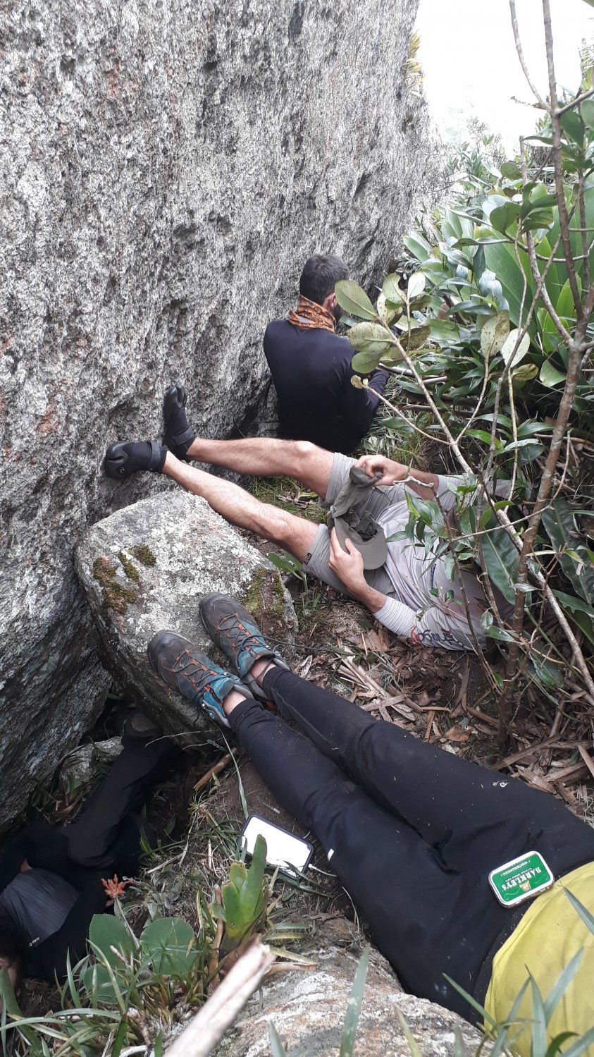 Rapidamente desmontei minha rede, guardei tudo na minha mochila, apanhei um litro de água de bromélia e nos despedimos do Eixo. Na volta, descemos arregaçando, tão rápido que nem nos demos conta de como descemos a perigosa rampa de acesso, passando pela floresta de samambaias, feito uma bala. Felizes da vida, fizemos planos de voltar em tempo record e ficar de bobeira tomando banho de praia, mas nem tudo é tão fácil como parece. O projeto era tentar voltar pelo mesmo caminho que viemos, mas raramente conseguíamos nos manter na trilha, mesmo seguindo o gps, muito porque, tínhamos que tentar encontrar as passagens nas rochas e nas fendas e isso era quase impossível. O tempo foi passando e a gente cada vez mais parecia não ir a lugar nenhum, tanto que ficamos travados encima de uma das rochas gigantes, onde o Flórido teve que recuar porque não consegui descer no mesmo lugar que o Júlio passou e eu, o Potenza e o Thiago fomos obrigados a nos valermos de uma corda e nos enfiarmos dentro de uma fenda de uns 10 metros de altura e descermos ralando tudo nela.