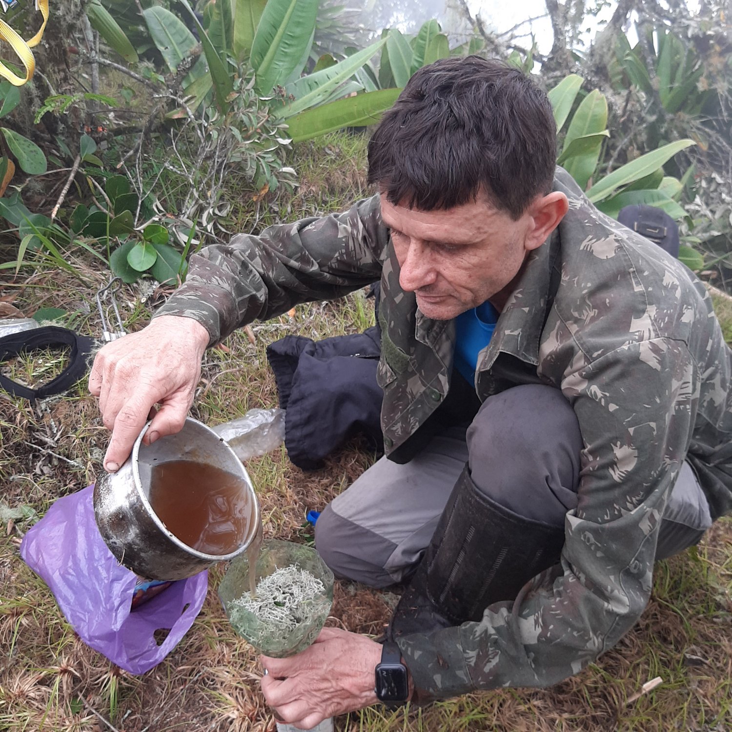 O certo mesmo era que o cume do Eixo ainda se encontrava quase todo fechado, mas como ainda mal havia passado das 3 da tarde, tínhamos a esperança de que perto do pôr do sol conseguiríamos ter vistas amplas. Enquanto a maioria ficava por ali, no minúsculo cume a jogar conversa fora, eu tinha uma tarefa a cumprir: Tentar arrumar água para poder passar a noite, já que eu havia subido com míseros 1500 ml. Nesses anos todos sempre me preocupei em aprender algumas técnicas de sobrevivência, mesmo virando chacotas de alguns que ficam nos chamando de Rambo. Pois bem, no alto daquela montanha isolada do mundo, vislumbrei a possibilidade de conseguir água através das bromélias, mesmo que fosse uma água de aspectos repugnantes, contendo aranhas, baratas, moscas e todo tipo de cadáveres e resto mortais de insetos e outros bichos nojentos. Fiquei o resto da tarde nessa tarefa até conseguir extrair cerca de 3 litros de água e depois fazer um filtro com musgos, gaze e algodão e no final, passar por um pouco de carvão ativado e adicionar umas gotas de clorin.