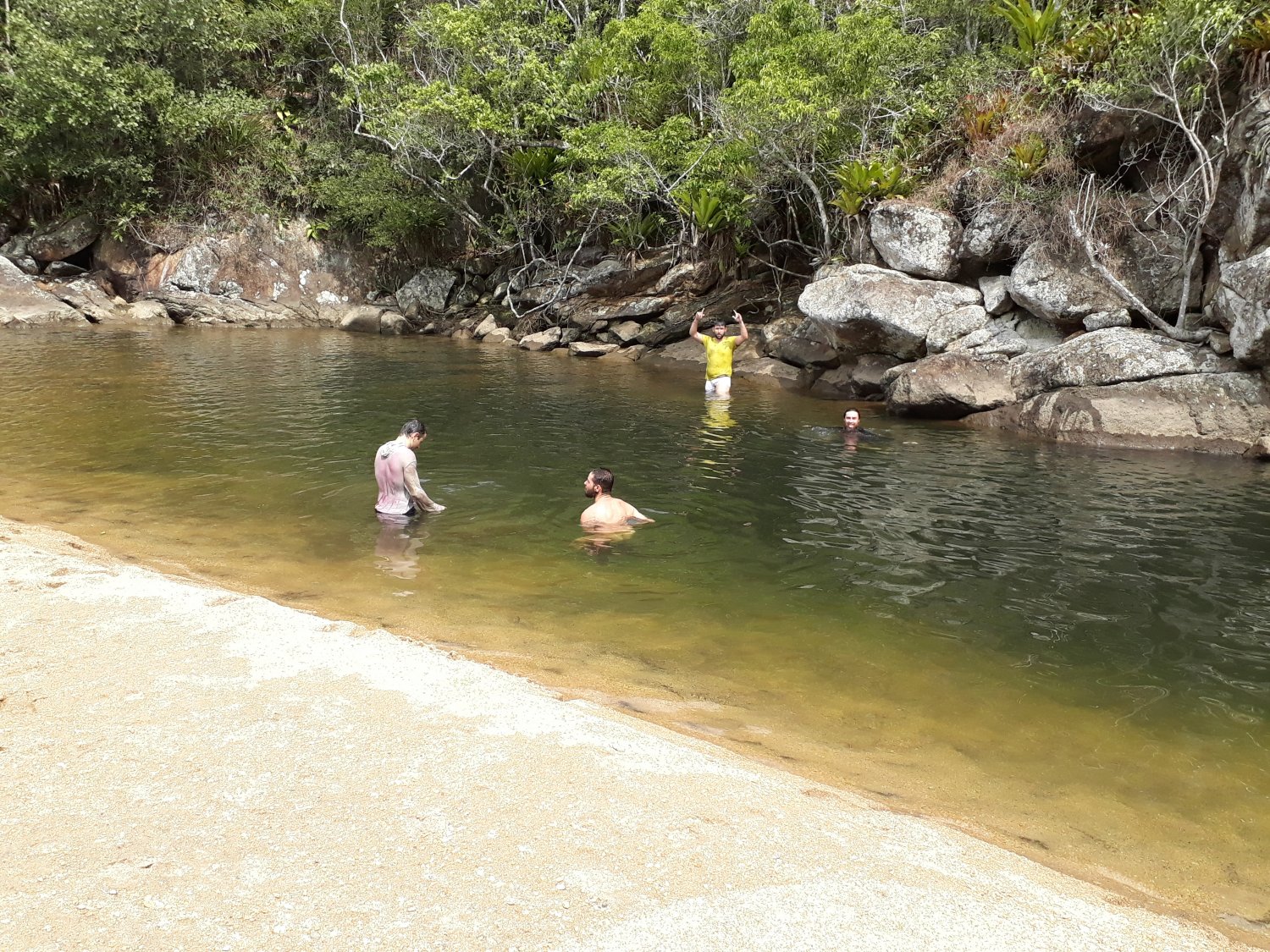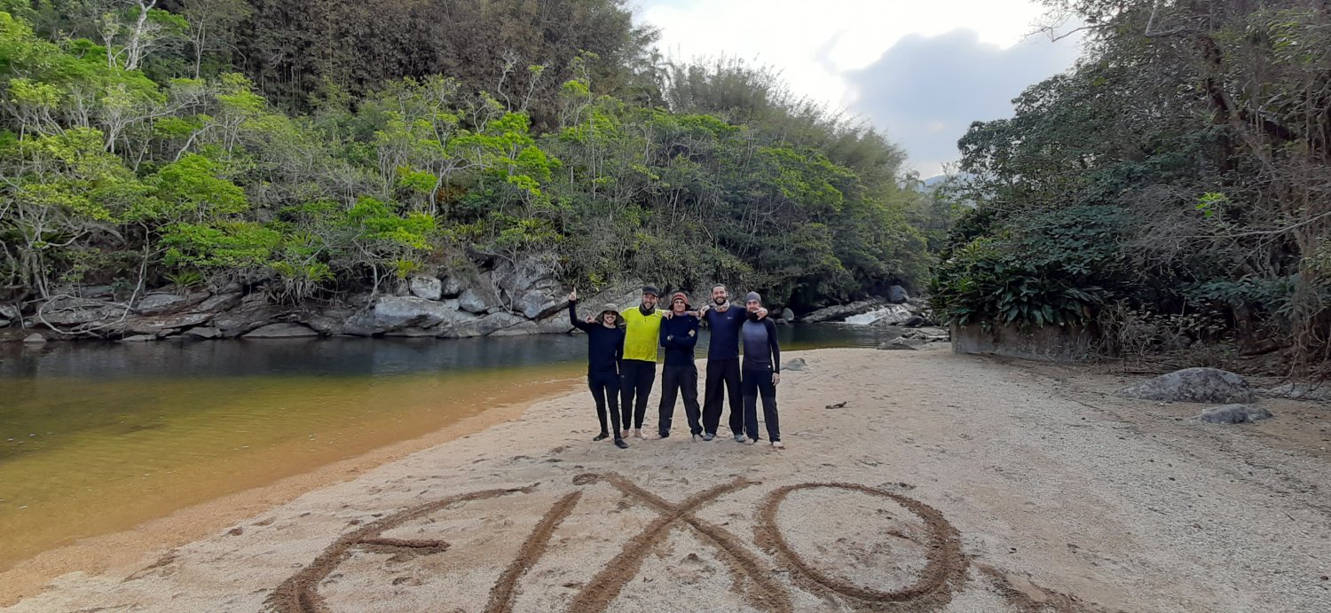 O calor estava de lascar, mas a gente estava imbuídos de chegar o quanto antes no litoral. Nos desviamos de tudo que era pedra pelo caminho, descemos o lance da samambaia até que a trilha aplainou de vez e a gente acabou tocando para a parte superior do Rio do Poço, mas alguns resolveram que seguir pela trilha seria melhor que ficar pulando pedra, então retomamos nosso caminho e pouco depois da uma da tarde, atravessamos novamente o Rio do Poço 100 metros acima da praia de mesmo nome e sem cerimônia nenhuma, diante de uma plateia de meia dúzia de turista, nos abraçamos e nos cumprimentamos calorosamente, a jornada ao MORRO DO EIXO havia chegado ao seu final, uma EXPEDIÇÃO para entrar para história.