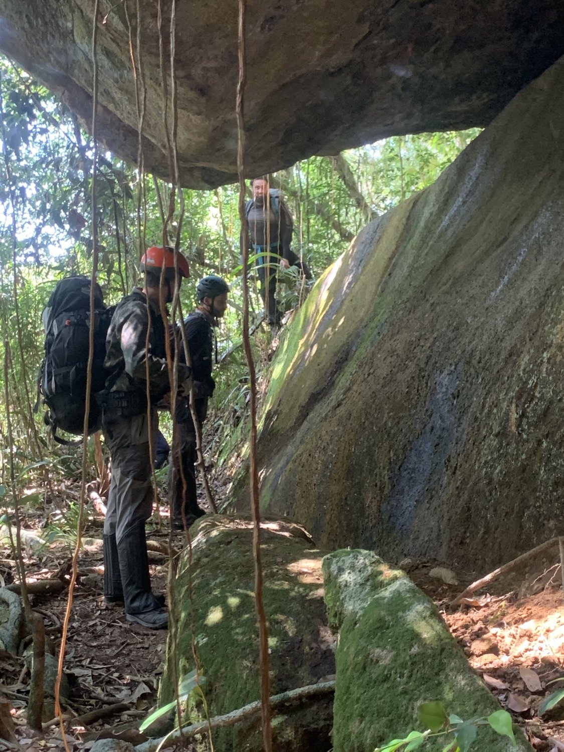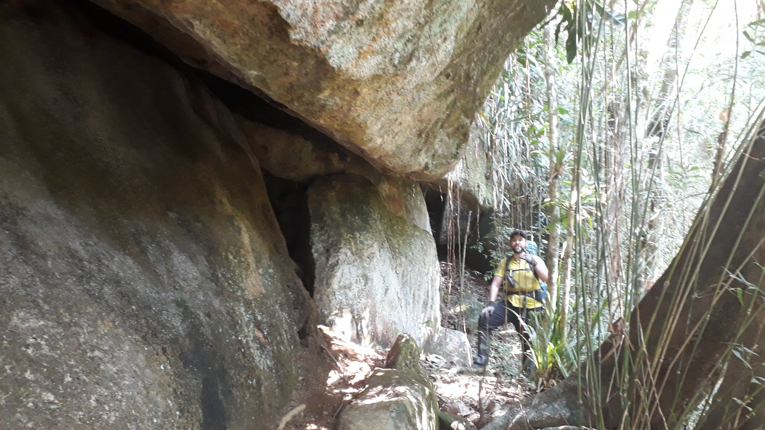 O dia já vai pela metade, o terreno não arrefece em nenhum momento e a cada metro ganho, a cada curva de nível que vai sendo deixada para trás, é a certeza de que mais próximo vamos ficando do nosso objetivo, até que somos surpreendidos por um gigantesco bloco de pedra empilhado que demos o nome de PEDRA MONTADA. E é mesmo surpreendente o tamanho daquelas rochas, que formam grutas superiores que talvez jamais tenham visto pés humanos.
