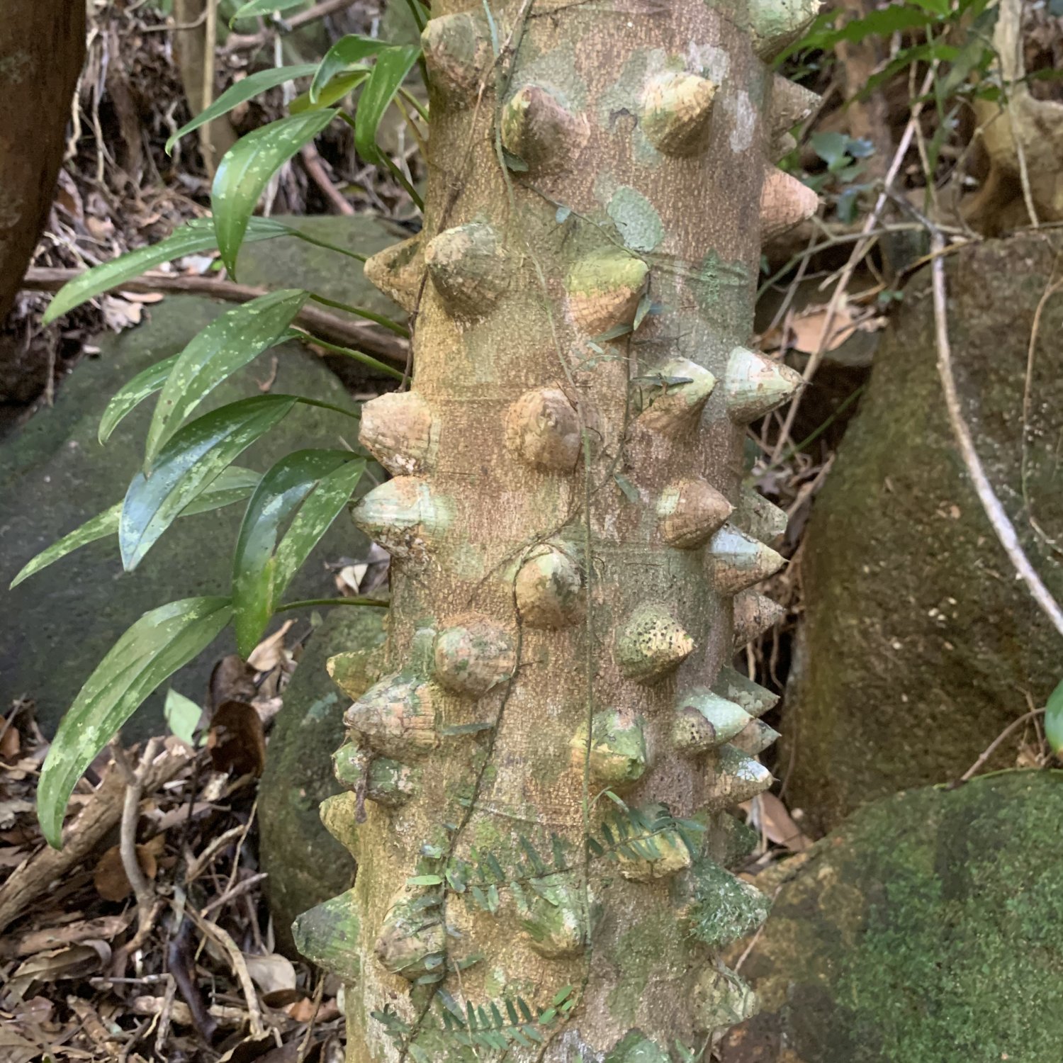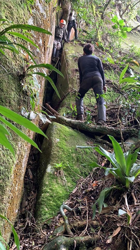 Barrados por mais uma grande parede e seguindo as indicações dos navegadores, saímos pela esquerda a procura de uma passagem ou alguma forma de podermos subi-la. É uma rocha incrível, uma parede de 90 graus com lances negativos que vão formando tocas e abrigos. Fomos nos enfiando por baixo dela até surpreendentemente darmos de cara com uma passagem, um GRANDE PORTAL, como um túnel do tempo que pudesse nos transportar rumo ao cume. Aquela fenda aberta na parede de pedra, como uma escadaria para o céu, talvez seja o grande segredo para o sucesso dessa expedição. Aquele achado mudaria completamente o rumo das coisas, sem ele poderíamos tranquilamente perder mais um dia, mas a sorte ajuda aqueles que persistem. Na entrada desse portal, uma árvore com espinhos enormes parecia ser a guardiã, uma espécie muito parecida com uma paineira. Adentramos ao portal, caminhando alucinadamente e felizes pelo achado que nos elevou para outro patamar. Flórido continuava gritando que deveríamos seguir mais à esquerda para escaparmos de outras tantas rochas gigantes, mas o terreno não aceita ordens e automaticamente somos obrigados a cair pela direita, fugindo de um abismo lateral, até que pudéssemos corrigir a rota.