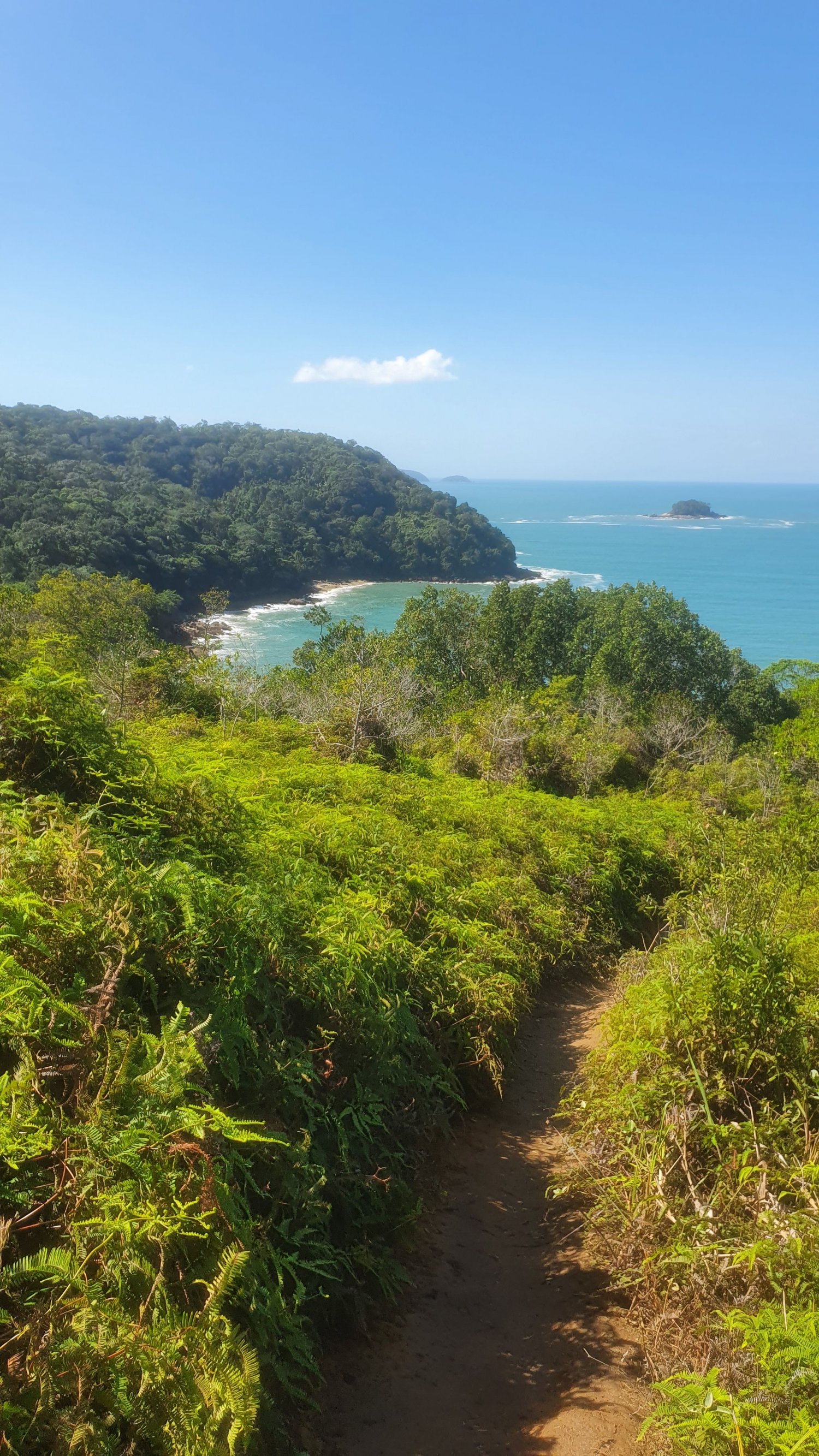 A sequência do caminho também é no final da praia, junto a um riacho, que deve ser cruzado e a trilha encontrada andando-se alguns metros para a esquerda, mas uma placa se encarrega de nos mostrar a direção. Até a próxima praia levaremos cerca de meia hora e no início, a trilha é bem fechada e vai subir ao alto, onde teremos uma vista deslumbrante da ilha do Mar virado e outras ilhotas ao redor. A trilha vai cruzar por mato ralo e começar a descer para valer, se enfiando em canaletas até que nos determos por um instante para admirar as praias que almejamos, bem no mirante improvisado, um cenário de tirar o folego.