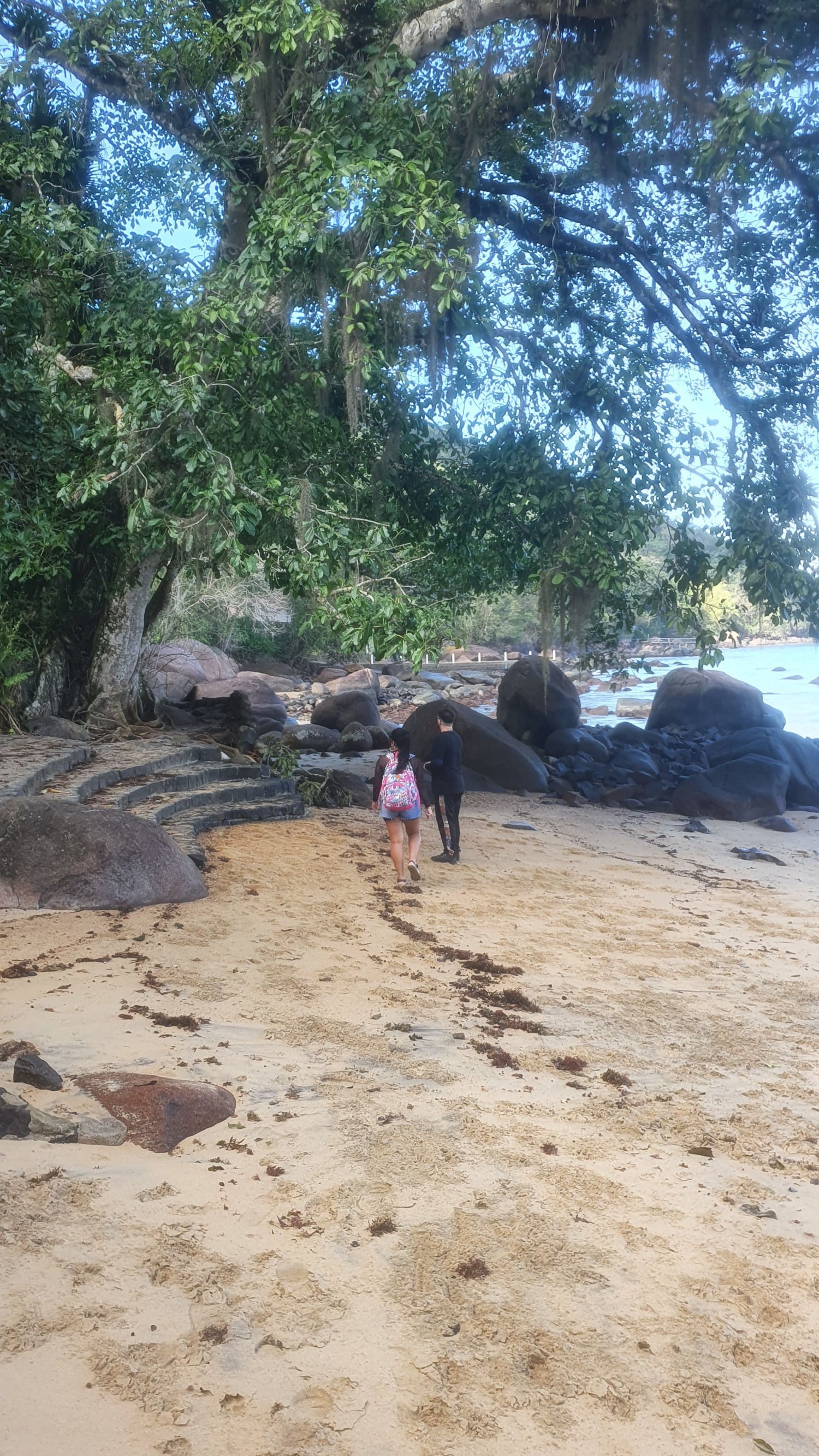 Sem perder tempo, atravessamos essa prainha, interceptamos a trilha, passamos por uma árvore gigante, onde uma escadaria em círculo leva a uma linda construção que mais parece anteceder a entrada de um castelo.