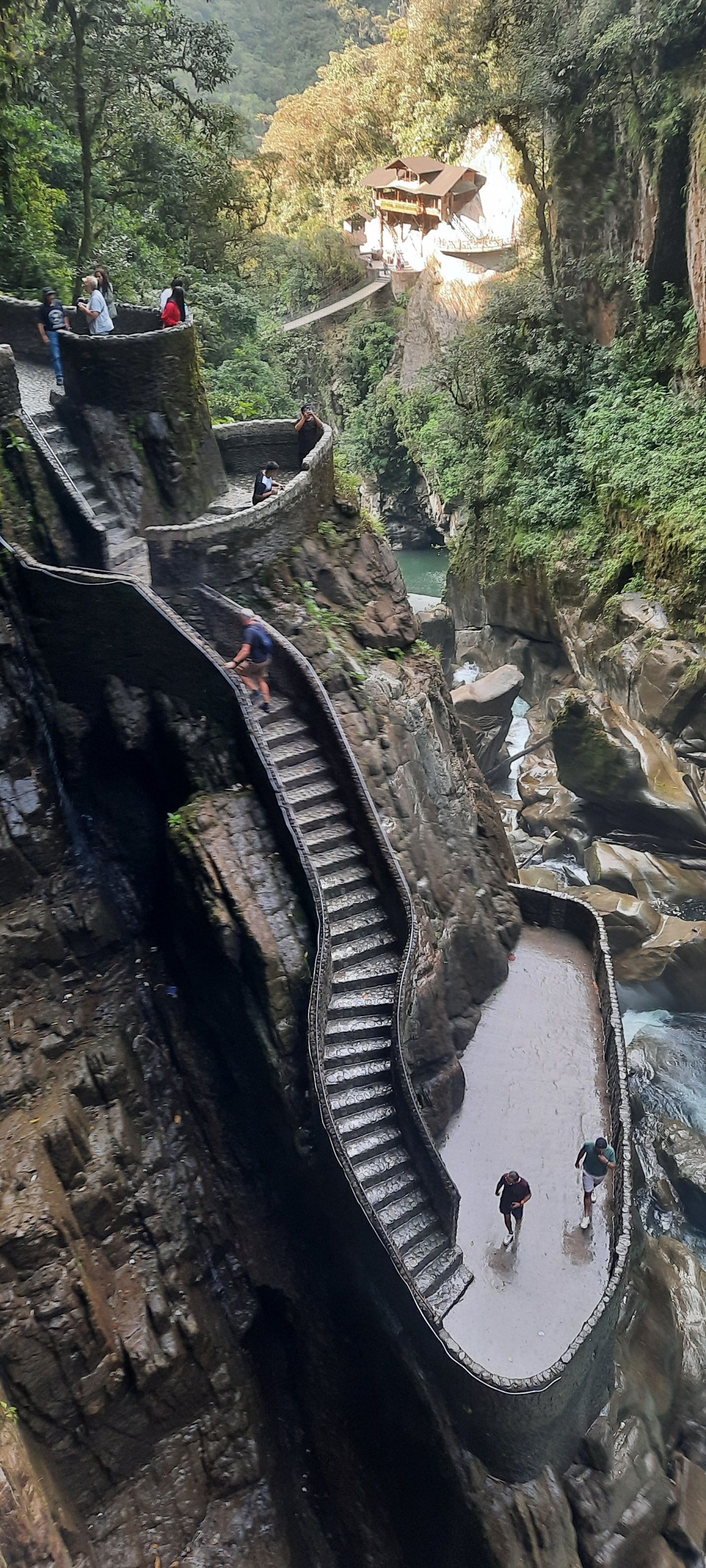 Vamos passando por meia dúzia de grandes cachoeiras, parques, pontes pênsil e uma infinidade de atrativos dedicados aos esportes de aventura, até desembocarmos definitivamente na mais famosa cachoeira do Equador . A PAILÓN DEL DIABLO( caldeirão do Diabo) é quase um símbolo da região de Bañhos e atração mais visitada do lugar e mesmo sendo a rainha das águas do país, custa míseros 3 dólares, um valor ínfimo se comparado a qualquer cachoeira mais sofisticada no sudeste do Brasil.