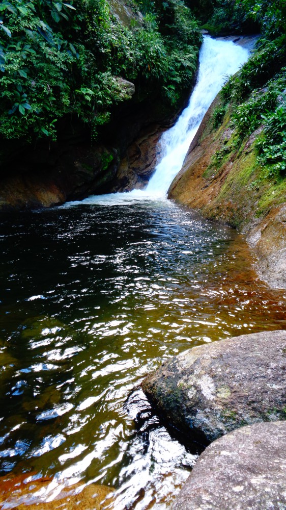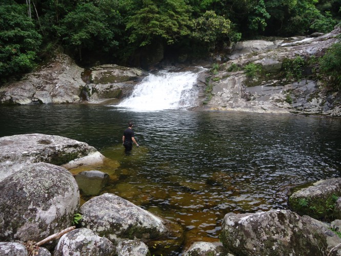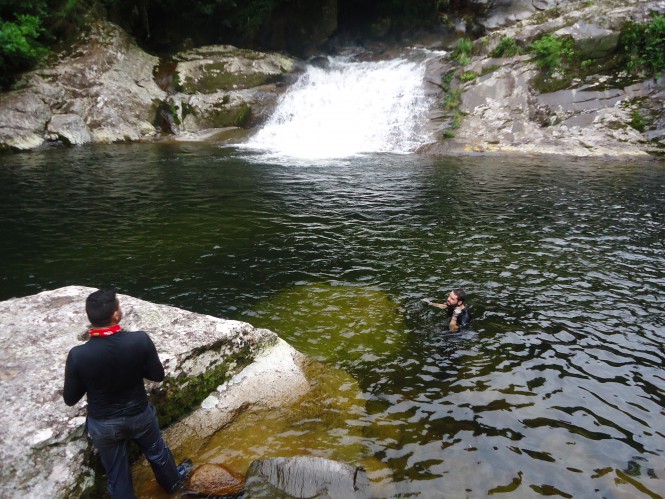 Escalada essa pequena cachoeira, surgiu à nossa frente, mais uma cachoeira muito parecida com a anterior, mas com um poço gigante, esverdeado, daqueles de cair o queixo. Já me joguei para dentro dele e fui nadando até ela, enquanto o resto do grupo bordejou pela esquerda, mas somente depois de cada um se esbaldar dentro do lago esmeralda. Não havíamos caminhado nem três quartos de hora e já havíamos nos apaixonado pelo rio e ficávamos a todo o momento nos perguntando por que um lugar daqueles, tão perto da trilha principal, não havia sido descoberto pelos turistas.