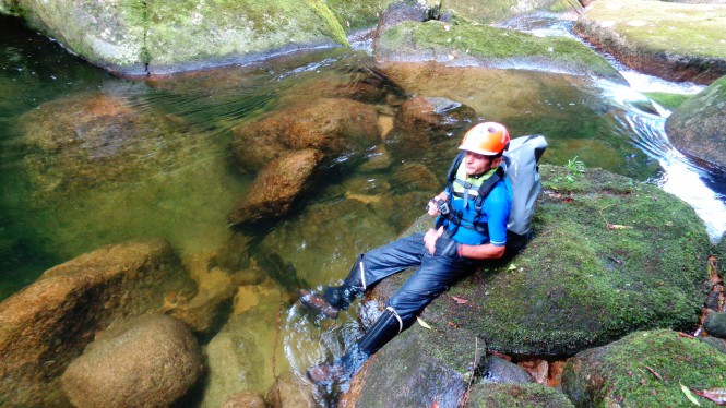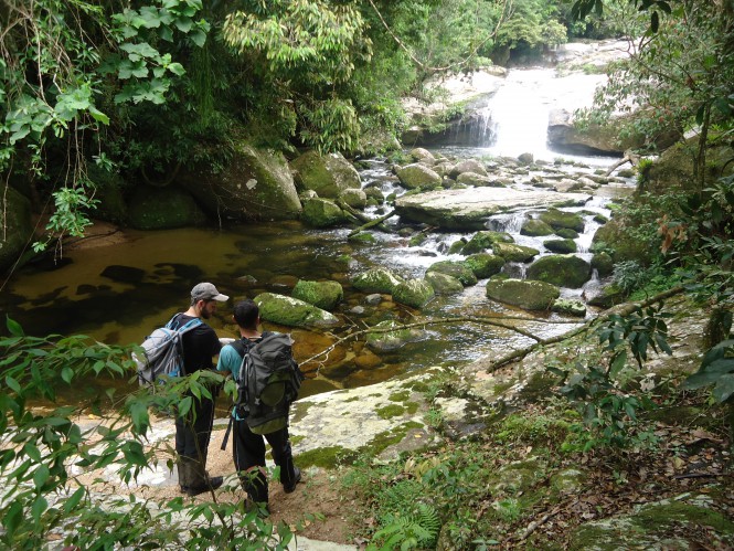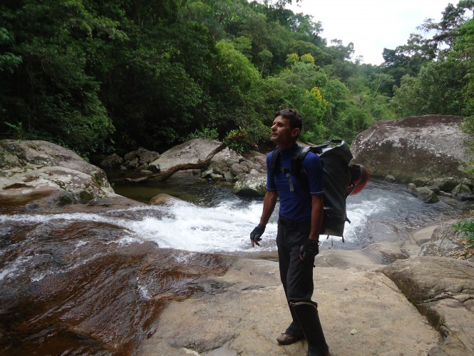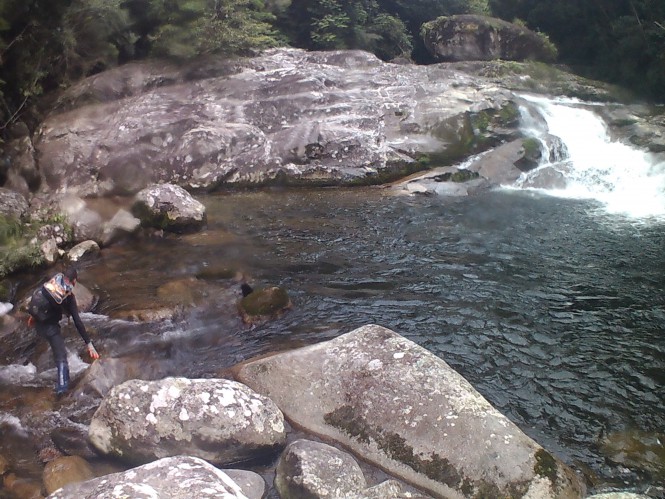 Num primeiro momento tentamos achar um caminho pela direita de quem sobe o rio, prestando atenção para ver se não achávamos uma trilha perdida nesse início de expedição, mas surpreendentemente encontramos um mato totalmente fechado, denunciando assim que, mesmo sendo uma trilha turística, ninguém se atreve a subir o leito do rio. Abandonamos o mato e nos enfiamos por dentro do rio mesmo, pulando de pedra em pedra, mas não deu nem cinco minutos e nos deparamos com uma parede intransponível, num amontoados de pedras grandes