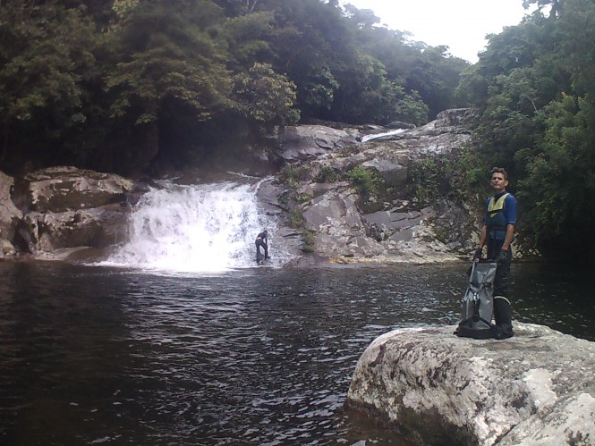 Eu até pensei em escalar por dentro da água, mas os meninos acharam cedo para se molhar e o Asheley foi à frente e encontrou um buraco no meio dos matacões, aonde você tem que se enfiar e atravessar como se tivesse saindo do útero da sua mãe. Demos a volta nessas grandes pedras e voltamos ao rio novamente e logo nos deparamos com uma cachoeirinha incrível, com um poço profundo e como eu era o único que portava uma mochila totalmente estanque, os meninos optaram por passar e subir ao lado dela e fizeram um grande malabarismo para não se molharem, mas eu não me fiz de rogado e logo cedo já me joguei na água.
