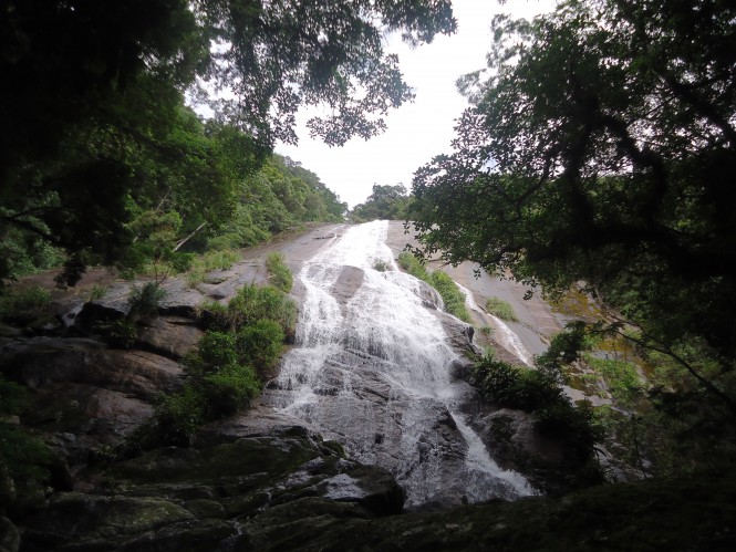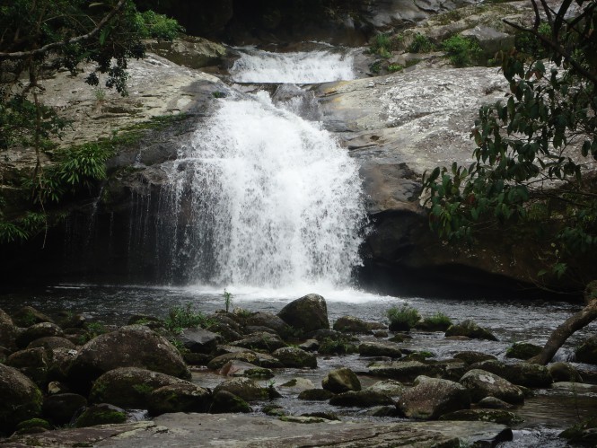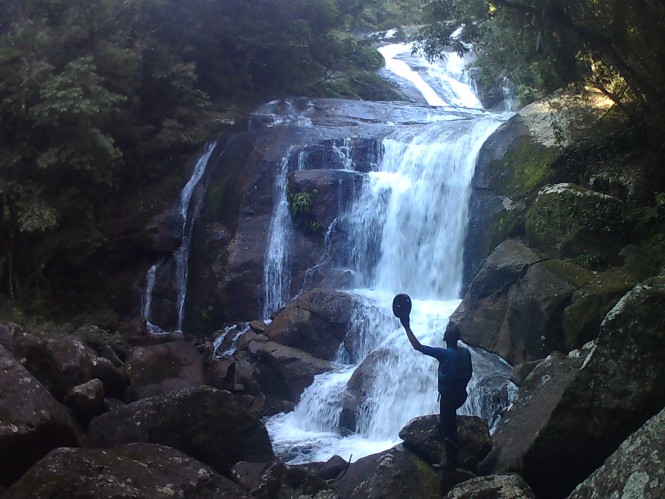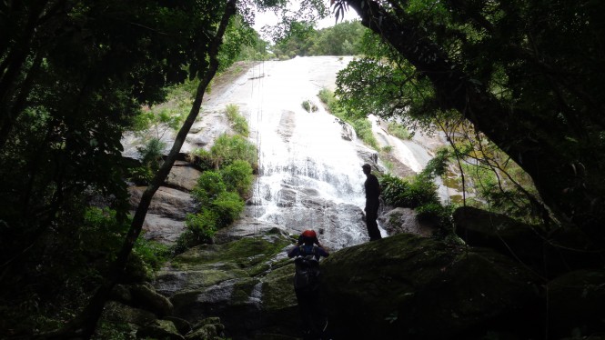 Já passava das 17 horas e nada da gente chegar a tal confluência, então decidimos que avançaríamos por mais uma hora e acamparíamos no primeiro lugar decente que encontrássemos. Como o rio não deixava avançar, resolvemos varar mato pela direita e nos enfiando numas grotas e paredes de pedra que iam formando uma espécie de cânion seco, um lugar muito bonito , com uma paisagem diferentes das que estávamos acostumados na Serra do Mar no continente. Passado esse trecho, o barulho de uma grande queda nos chamou a atenção, então abandonamos o vara- mato e voltamos ao rio para nos encontrarmos com a maior queda até então. Aquela sim era uma cachoeira de respeito e aquele poço era algo para agradecer e fazer esquecer os perrengues passados até agora. Ficamos todos encantados com aquela queda e as caras amarradas pela ultima hora passada no mato, sendo estraçalhados por espinhos e cipós, se abriram num sorriso de felicidade e juntos decidimos que era mais que hora de descansar os esqueletos e mais que depressa retomamos a caminhada, sempre de olho em algum lugar plano para montarmos nossas redes.