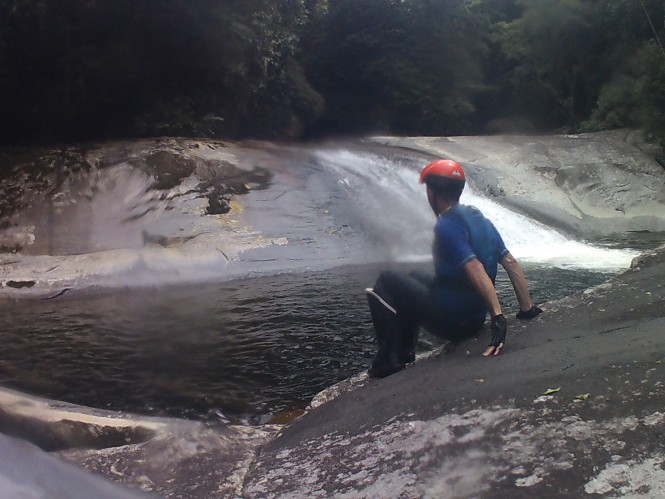 Escalei a cachoeira e me encontrei novamente com a galera e juntos pulamos pedras e quinze minutos acima chegamos ao POÇO DO ESCORREGADOR, uma grande atração desse roteiro, uma pedra inclinada e extremamente lisa, de onde o rio se precipitava. Escalamos a rocha pela esquerda e largamos nossas mochilas do lado direito do rio, hora de comer algo e nos lançarmos de volta ao passado, hora de viramos crianças novamente e escorregarmos nossa felicidade para dentro da água.
