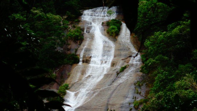 Bom, como a nossa intenção era explorar os dois rios apenas com mochila de ataque, deixando o nosso acampamento montado, apenas enfiei na minha cargueira os equipos de emergência, caso algo desse errado, isso me daria um conforto maior pra sobreviver por uma noite ao relento. Plano traçado, aferimos o azimute e partimos atravessando o rio, subindo o barranco e já descendo a um vale com um córrego de águas cristalinas. Galgamos terrenos em nível por menos de 15 minutos e já nos deparamos com o véu da grande cachoeira. Ninguém disse nada, cada qual procurou se livrar do mato que nos fechava a passagem, cada qual se apegou ao seu espírito desbravador e no fundo todo mundo sabia que aquele momento era de pura magia e encantamento e quando a paisagem se abriu de vez, cada um correu para onde achava melhor e de onde estávamos ficamos lá parados a contemplar o GIGANTE despencando da pedra. A GRANDE CACHOEIRA DO AREADO se apresentou ao nosso grupo, mas se recusou a se mostrar por inteira porque seu gigantismo é tão imenso que não é possível vê-la por completo. Aquilo que a gente esperava se confirmou diante dos nossos olhos e aquela era de longe, mas de muito longe a maior cachoeira de Ilha Bela. Sua altura passava fácil de 150 metros, mas de tão grande mal podíamos ver um terço dela.