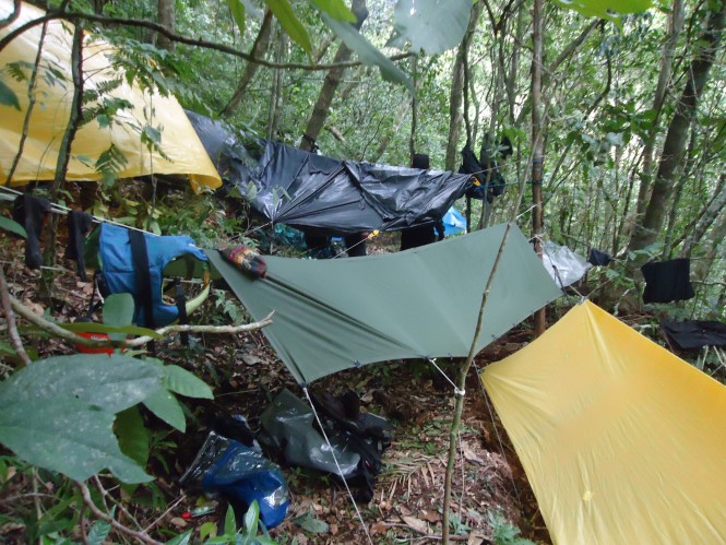 Ficamos felizes de termos cumprido com o objetivo do dia e não havia mais o que fazer, encontramos um terreno favorável para montarmos nossas redes e demos por encerrado esse primeiro dia de expedição. Parar ali foi mesmo fundamental porque o dia ensolarado já havia partido e no alto da serra ,uma tempestade já se avizinhava. Parte do grupo se apressou em montar suas redes, enquanto a outra parte ficou moscando à beira do rio e o Asheley ainda escapou por pouco de tomar uma picada de jararaca. O tempo virou numa velocidade inesperada e a tal tempestade chegou de vez. Eu havia já montado minha rede e meu toldo, mas não deu nem tempo de esticar todas as cordinhas antes que o dilúvio desabasse. Pulei para dentro da rede e fiquei segurando a cobertura para o vento não levar e torcendo para que minhas coisas continuassem secas. Choveu desgraçadamente durante quase 2 horas e a turma que demorou em montar abrigo, acabou por pagar o seu preço e depois de se lascarem todos, foram dormir sem janta. Quando a chuva deu um tempo, minha rede estava meio unida, mas nada do que eu já não tivesse acostumado, mesmo assim eu estava feliz porque os famosos borrachudos de Ilha Bela não haviam dado as caras com aquela voracidade já conhecida e isso já era algo para comemorar e eu e o Potenza resolvemos fazer uma janta e saborear um bacon com arroz, pra fechar a noite e alegrar a alma.