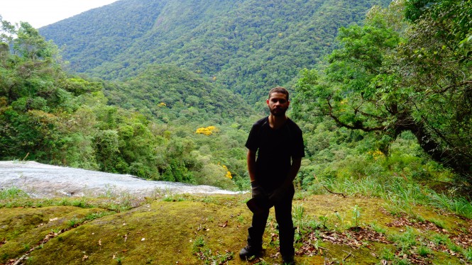 À nossa frente agora, uma parede íngreme, que logo conseguimos chegar ao seu topo e vendo que estávamos na calha do rio buscado, partimos para uma diagonal definitiva, descendo de vez até as margens, aonde fomos parar bem no meio de uma cachoeira que nem chegamos a ver seu topo de tão grande que era. Nesse momento vimos que o melhor a fazer era nos distanciarmos do leito do rio e ganhar mais altitude, numa tentativa de alcançar o seu patamar superior e foi o que fizemos e mais uma vez nos deparamos com uma cachoeira ainda maior onde o Daniel Trovo achou que ali seria nossa ultima parada antes de nos jogarmos dentro do próprio rio e descê-lo, explorando todas suas cachoeiras até interceptarmos de novo nosso acampamento perto da confluência. Mas foi aí que um pequeno impasse se instalou entre o Trovo e eu e o Potenza. O Trovo achava que deveríamos atravessar por ali e eu e o Potenza insistíamos que o topo das cachoeiras ainda não havia chegado, mas depois de uma conversa mais demorada, chegamos a um consenso e convencemos o Daniel de que deveríamos continuar escalando. O Asheley tomou à dianteira e Foi puxando a fila até que nosso caminho chegou ao fim, barrados por uma parede intransponível e que mais uma vez nos deixou travados no meio de uma queda d’água.